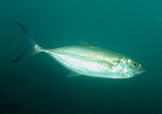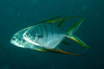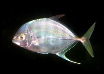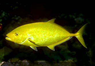 Jacks are often mistaken for Tuna fishes… with their robust, compressed to torpedo-shaped (fusiform for you fancy types) bodies, thin caudal peduncles, large eyes… other adaptations for continuous, at-times rapid swimming in open water. What does this family have to do with pet-fishing? Good question… as more and more we've seen a couple of species of carangids regularly offered in the hobby. Jacks, though often beautiful, interesting behaviorally, get way too big, fast, for home hobbyists. Hence my cautionary article on them here. Classification: Taxonomy, Relation With Other Groups Jacks and Pompanos are typically "shiny" in appearance, most with just tiny cycloid (non-interdigitating) scales, often with separate finlets behind their one or two dorsal fins… often with bony scutes along lateral line… large eyes, deeply forked tail fins… being good fighters on a fishing line, and tasting (many of them) great. This is a good-sized family of some 33 genera and about 147 species… many are important food and game fishes. Range: Carangids are all marine fishes with some species venturing into brackish waters. The Family ranges widely in the tropical to temperate Atlantic, Indian and Pacific Oceans. They are mainly found in shallow water, above reefs and in the open ocean. Size: Some species only grow to eighteen inches (50 cm.) in length, others to more than six feet (two meters). They are remarkably fast growers. Key Species: Though the trade mainly sees just the following two, periodically other species of carangids are offered. Their lack of mention here should not encourage you in trying them. None have proven to be easy to keep unless received in good condition and met more than halfway in their requirements (see below).