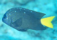 As juveniles these extra large damsels are dazzling (Volume 1 of T.F.H.'s Marine Atlas p. 397 shows the young and adult garibaldi, p. 408 the giant damsel). While you're there please note the other pictured "jeweled damsels pictured; the frequently offered Caribbean Microspathodon chrysurus, the semi-official 'true' jewel or neon-velvet damsel, Neoglyphidodon oxyodon, and the much less seen Plectroglyphidodon lacrymatus, both from the west Pacific. The Cortez jewel-markings as a youngster are easy to distinguish from the other purple-blue dotted species. Unlike the Caribbean member in the same genus, it lacks a yellow tail. The number one problem with these two "big boys" is just that; they get too darn big. Oh sure, they're cute and oh-so active when tiny young. Ask someone who has been terrorized (yes, that's the right word) by a couple of inch domino while working in a marine tank. I've seen damsels draw blood. Gram for gram (ounce per ounce) they are amongst the toughest meanest turf fighters among reef animals. If they can intimidate an aquarist, imagine how their tankmates feel. Now just think how it would be if that three spot domino got to be over a foot long and two pounds in weight. Our two jumbo damsels do. Secondly, the issue of temperature. The Garibaldi is a Baja and U.S. California local. It lives in water that spans the fifties and sixties of degrees Fahrenheit. The Giant Damsel hails from Mexico's Sea of Cortez on down to the middle of Central America on the East Pacific coast in water to the mid-seventies. Both these fish stress out at higher temperatures. Selection: So, now being informed consumers, knowing full well how big and fierce these species are, and their penchant for cooler water, you still want to try one out? Well, let me help you choose a healthy specimen. Season: For garibaldi purchase a specimen that has been collected in the warmer, summer months. This is easier that it may seem. Most are on the market within a few days to weeks of wild collection. Size: For both jumbo damsels; get a small specimen, one to three inches, as these move and adapt more easily. Color: Select for brightness of color and don't worry about cyanide enhancement of the same. These species are collected without poisons. Simple baiting and hand nets are all that's required. Environment: Habitat: Both species are found in close association with broken rocky bottoms, patch reefs that they do not leave- ever. Surveys of garibaldi have found them at the same lek territory for more than fourteen years; they live more than twenty. Water Quality : True to the rest of their family, the giant damsels are undemanding chemically and physically. Circulation and filtration should be brisk as these are active, big-eaters that appreciate high oxygen concentration and challenging currents. One important parameter to keep up with is pH; 8.0 plus. These fishes are good bio-indicators. If the environment's going down-hill they will indicate the same, quick. Temperature strain can be seen immediately as color loss and hiding behavior. The appropriate use of a chiller or temporary means of lowering the temperature is suggested. Compatibility: Mixing members of the same species is generally a disaster. Unless you have a humungous system (a hundred or more gallons), with more than virtual piles of rock for hiding, and a marked discrepancy in size, one to a tank please. Disease: Both these damsels are more resistant than smaller damsel species to infectious diseases and parasites. Freshwater dips, lowered specific gravity and copper solutions are standard treatment modes. Foods/Feeding/Nutrition: Like most damsels the garibaldi and giant damsel eagerly scarf down more than their share of all types of foods offered. An important observation here regarding stomach contents analyses of wild specimens. A big part of what's found in them in situ is algal and sponge (phylum Porifera) material. In fact these fishes are instrumental in culturing large patches of algae and brilliant orange, red and yellow sponges; the former found over and the latter underneath the rocks where they live. When deprived of sponge foodstuffs their color fades. I suggest daily feedings of something meaty; shrimp, clam and the like and algal and sponge material. These foods are available pre-made through the hobby; occasional live (rock) material is relished. Reproduction: Garibaldi and the Caribbean Jewel damsel have been raised in captivity. Eggs are collected in the wild from males' nests by combing (as in hair comb) the eggs out of prepared and defended algal bed areas. These have been raised in specialized hatchery tanks, fed rotifer cultures. If you're interested in trying the this, see the reference section. Moe and Forrest, 1981, give details of spawning and development of the giant damsels closely related congener, the Atlantic jewel Microspathodon chrysurus. Chris Turk of Ocean Nutrition, myself and other friends used to do this with garibaldi in the late seventies in San Diego. Damsels are substrate spawners much as many of the freshwater neo-tropical cichlids, with males cropping an algal nest, enticing females to lay eggs, guarding against raiders providing care before a variable pelagic larval phase (Thresher et al. 1989). As young develop they must seek a nearby unoccupied patch reef space, frequently hiding from large conspecifics. Summary: Want a colorful, out-going to the point of being obnoxious, rough and tumble specimen? have a cooler temperature tank, or better still one with a chiller? Looking for a fish to outlive the family dog? Don't mind it getting BIG and eating you into poverty? The jumbo damsels are for you. Bibliography/Further Reading: Allen, Gerald R. 1991. Damselfishes of the World. Mergus Publishers, Melle Germany. Bader, Beth. 1993. Photographing the Feisty Damsels. Sea Frontiers. May/June 93. Burgess, Warren E. 1975. Salts From the Seven Seas (Atlantic Jewelfish). Tropical Fish Hobbyist. 10/75. Burge