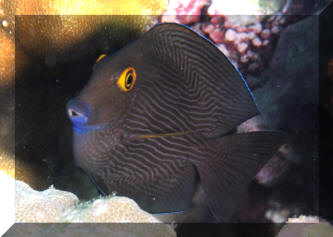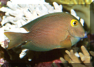 3) Behavior: the element of "brightness", curiosity in the environment, normal swimming and evasiveness cannot be discounted. Buy well-adjusted specimens. Kole Systems, A good fifty-sixty gallons is a minimum volume to house one of this species... at least twice this if you want to try two together, or other related Acanthuroids. Plenty of healthy, established live rock, vigorous circulation, filtration and aeration complete the picture of a good physical system for Ctenochaetus. Kole Feeding, Though this species feeds almost exclusively on attached filamentous Green & Red algae species in the wild, it generally adapts quickly to other food formats and kinds in captivity. Some meaty foods like Cyclop-Eeze, Mysids and Artemia are a good idea to mix in at least weekly, with live algae (Gracilaria/Ogo, Spirulina...) being best, prepared algae products like Nori wafer not often taken. Of course, having an abundance of healthy live rock with its constituent algal component will go a long way to providing continuous forage for your Bristlemouth Tang. Kole Disease, Unless your dealer has very good feeding practices, it's best not to leave Koles (or other Tangs for the matter) at your dealers for too long. In fact, this is one genus where quarantine, and its too-often evils of vacillating water quality and starvation is best skipped altogether, in favor of an extended pH adjusted freshwater dip/bath. Oh, and do take care if handling this fish, even in a net... take care if/when supporting it in there with your bare hand... The stiletto like "tang" on their caudal peduncle is very sharp... and they know how to use it. Unless your Kole (and other tankmates) have discernible protozoan involvement, anomalous signs of ill-health, like brown spots and blotching are best treated with products that bolster immune systems... Vitamins, HUFAs, Beta Glucan... Almost always, such troubles are directly or indirectly related to either some aspect of diminished water quality or aggression by tankmates. If you must turn to formalin and/or copper compounds, do administer these stringently on the low side of dosing. Cloze: They Yellow-Eye or Kole tang is deserving of much wider use in our aquarium interest... It's a hardy, hard-working algae scraper that is attractive, non-aggressive, doesn't get too large... and is relatively abundant and easy to collect in the U.S. 50th State's waters... Do you have space, a need for such a diligent worker?