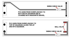 250 Gallon Flow 10/22/07 Hi Crew, I am still in the process of setting up my 250G. The tank is 72x30x25. I wanted it to be wide so fish can swim both sides of the rockwork. Along with the sump return I am setting up a closed loop with 2 x 1.5" feeds located on each side of the tank about 2" from the bottom of the tank. I was thinking about putting suction strainers (such as the ones here: http://www.lagunakoi.com/prod202.html) on each one and building a "cage like" that in the October "Tank of the month" and building the rockwork around it. Seemed like a good idea. Now I am concerned that I will be getting too much flow around the bottom of the tank and stirring up the sand too much. I'm planning on around a 2" sand bed and then having the intake about 2"above the sand. The closed loop will be driven by a Sequence Dart pump. Also, only one side will be operating at a time. Each side consisting of a 1.5" feed and 3 X ¾" (or 1" ?) returns. The system will be set up so that when the left intake is open, it will output on the right side, and when the right intake is open it will output on the left side. Onto my questions; do you think that the 1½ " feed will starve the dart too much? <Sequence recommends that the intake line be as large or larger than the output line. That being said, many people plumb Darts with 1 ½ " intakes with no issues. Just be aware that there will be some diminished flow doing so. > Will there be too much suction in the lower portion of the tank (stirring up the sand)? <The suction at 2" above the sand is cutting it very close, especially when you consider that the suction in the line is not the only thing that can kick sand into the intake. Certain fish love to blow sand around. Reef pumps inevitably process some sand, but I would try to minimize it and put the intakes higher in the tank. You could even possibly angle the intakes up with elbows considering you plan to hide them with rockwork. This would give you some adjustability in the setup. > Will the 3 X ¾" returns generate enough flow? <I would probably make that 4 X ¾" or 3 X 1", 3 X ¾" would be awful brisk flow. As for overall tank turnover, without factoring in your sump return, this leaves you in the ballpark of 11-13 times turnover (accounting for intake size, plus there will be some friction loss), not much for SPS corals. It depends on what you want to keep in the tank and the flow of your sump return. > Grateful as always for your input. Olly <Nice tank, have fun, Scott> Re: 250 Gallon Flow 10/23/07 Thanks again for your insight, <Anytime, the question is much appreciated> as far as flow goes, I have another sequence dart that is plumbed into the 2x 1.5" overflows going back to 4 1"returns. <Two 1.5" overflows will probably not flow the full force of your Dart. You can put a ball valve on the output side and throttle the pump down. Do be careful about running your overflows at full capacity, some safety margin should be left.> Do you know of any calculator to figure out plumbing sizes? Ie, that 2x1" = 1 x1.5" . <The pump manufacturer has some good information on flow vs. pipe size on their website for pipe flows in accordance with their pumps. Reefcentral.com has an overflow calculator, but keep in mind this a numerical calculation and would be a best case scenario at full capacity. > What is your opinion on spray bars? I was thinking about plumbing the returns from the sump into two spray bars front and back at the surface. <Spray bars have the tendency to get clogged in a saltwater environment and can take a lot of trial and error to get the number of holes and the size of the holes just right. It would be less of a headache for you in the long run to stick with the 1" returns.> Thanks again, Olly <Thank you Olly, have fun, Scott V> Help With Plumbing For A 300-Gallon Tank...And The Need For A Bigger Drain Or A Smaller Pump! -- 07/17/07 I was hoping to get some of your opinions to help me on plumbing the returns to my tank. <<Okey-dokey>> I thought I had a good understanding on how I was going to go about setting this up, but the more thinking/planning about it I do- well, I think I've come to a point where I have thought it out too much and now I'm starting to confuse myself! <<Hee-hee!...does happen. Let's see if I can help make things clear again...>> I read, read, read and then read some more articles/posts but not everything is completely consistent...that or all this research is starting to become mind numbing <<Mmm, perhaps a bit of both... Keep in mind the information here comes from a wide array of opinions/experiences>> Anyway, my situation/question.... I recently acquired a 300-gallon acrylic tank <<Cool! I have a 375-gallon Tenecor acrylic display tank>> and it has one overflow chamber built in, and has several holes drilled for returns on the tank. <<Hmm...only one overflow on such a large tank? I hope it has a very large drain/bulkhead...>> The guy left all his plumbing for the returns attached, and was using 4 of the holes for returning the water (the rest have plugs). <<So there are extra throughputs available if needed?...excellent!>> Well first off....the overflow chamber... he had a 1.5'' bulkhead fitting but chose to reduce to a 1'' standpipe (doesn't make much sense)... <<Indeed... Typically the larger diameter is better for attenuating noise/helping with flow issues>> I want to utilize maximum flow rate, so I replaced w/ a new 1.5'' bulkhead (b/c the other was glued to the reducer) and added a 1.5'' Durso. <<Sounds like you know what you're doing thus far...>> OK, so the overflow/drain is good to go now.... <<Is a good start, agreed...but do realize the type pipe/tubing and configuration of the plumbing (drain line) will also contribute to the final result>> As for the returns, he used 1/2'' pvc piping. I want to achieve somewhere around 1200 gph so will need to replace the piping....I plan on using a Mag-Drive 18.... <<I'm afraid this pump and this flow rate are not reall