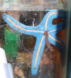 is nearing an end. Bob Fenner> Blue starfish with red bumps? Linckias and using WWM 11/10/06 Hello I just purchased another blue star fish. <... another nutter butter?> The first one died within 2 wks. I think It's because I did not do the acclimation process correctly. <Mmm... possibly a contributing influence/factor> I read up on how to do the acclimation, and brought another one. It has been 5 days, and the starfish has been moving around fine Until today I noticed it had some red bumps or spots on it. There is something (threadlike) hanging out of the middle (stomach area). Is this a sign of a disease? <Of a sort... overall stress reactions from...?> This first starfish started to ooze red stuff, then finally fell apart. Not sure what to do. Can the starfish be saved? <Not likely> thanks J & L <Please read here: http://wetwebmedia.com/stardisfaqs.htm and here: http://wetwebmedia.com/linckiadisfaqs.htm and the linked files above. Bob Fenner> Blue Starfish Dead? 10/17/2006 Hello, <<Hi!>> Forgive me if this is a stupid question. How do you tell if a blue starfish is dead? <<Check its pulse? :P>> I looked through the forums and found loads of articles referencing failing limbs, exposed sores, cuts, etc, but nothing that would tell me what a dead blue starfish would look like. I did see one article that said it would be obvious. My blue starfish was very active and moved around the tank frequently since I got him 6 weeks ago. Two days ago he stopped moving. Using the advice in the forum, I am not moving him. He looks like he is starting to slightly deflate. <<A sign of poor health if not death.>> Other than that, he looks normal without sores, cuts, etc. He just stopped and froze. <<Is he attached to the glass? If so not likely dead. In my experience dead starfish are quickly consumed by clean up crews 'watch him for further deterioration.>> Thank you in advance for your help for a very basic question. <<Glad to help. Lisa.>> - Joe Linckias... "take the blue... or the orange..." - 09/14/06 Crew, I bought one blue and one orange Linckia yesterday. I think I acclimated them slowly enough, but the orange one has been hanging out near the water surface (doing laps around the tank on the glass). The blue one has moved his arms some but not traveled. I understand from your site that 90% of these creatures do not survive. <More> We bought them "out-of-the-box" at our LFS because they give a discount and because we thought one acclimation was better than two. <...> How will we know if they are dying/dead? <Decay... the death of your other livestock...> Since the survival rate is so low I want to watch for an early demise and remove them from the system if necessary. My system has been up and doing well for a few months now and I would hate to have a big ammonia spike. Thanks, Mike <... BobF> Blue starfish...severe wounds!! Please can you help?? 8/18/06 Hi, my name is Kev and I've been keeping marines for nearly a year now. I have a 4 ft tank with 40 kilos of liverock, a Deltec mce600 skimmer and around 27x flow. The current livestock is 4 green Chromis, 2 ocellaris clownfish, a royal Gramma, a chalk goby, a six-line wrasse and a yellow tang. There are several red and blue legged hermit crabs, as well as 2 Halloween crabs. About 6 months ago I purchased a blue starfish (linckia laevigata). For the first 5 months it was very healthy and was very active. <Is a good long while for this species, genus in most marine systems> Then out of the blue a large chunk of flesh was hanging off one of the arms and there were some small wounds on a couple of the other arms. Around this time I had been struggling to control my nitrates and they had risen to around 30. Despite 6 large water changes over 4 weeks with ro water and instant ocean salt, the nitrates stayed the same. I bought a new test kit to make sure and the results were the same. I tested the new salt water and nitrates were around 1-2. After posting on forums, it was decided the nitrates were due to overfeeding. <And a lack of purposeful denitrification, uptake...> I have since cut down on feeding and have also changed my salt to Tropic Marin Pro Reef. Over the last month the starfish has been looking active again and has regenerated a lot of where the wounds were, despite nitrates at around 30. Last night, I came home to find another large chunk of flesh hanging off and the starfish looking worse than ever. This was totally out of the blue and I can't find what is causing this. The night before, my girlfriend had lit an incense stick outside the tank room. Could this be the cause of the starfish's injuries or could it be something else? <Likely the latter> I've asked on forums but I have received little feedback, none of which gives a confident cause. Have you seen this happen before and if so what was the cause? <Have seen numerous times... think this is best described as "cumulative stress" coupled with "captive unsuitability"...> I apologize if the email is long winded but I wanted to give as much information as possible to try and get to the bottom of what is causing my starfish to fall apart. I would be extremely grateful if you could shed any light on this situation. Kind regards Kevin Shackleton Yorkshire, England. <Please read here: http://www.wetwebmedia.com/linckiadisfaqs.htm and the linked files above. Bob Fenner> Green Linckia Star Disease My question to you is about my green Linckia star. <Graham at your service. I've had one of these Linckia sp. starfish for almost a year now. In my opinion, these are extremely hardy provided you give them stable water parameters as well as a sufficient food source (Such as lots of liverock). Here is a picture of mine which was taken roughly 7 months ago: http://ee.1asphost.com/spsfreak100/Dsc07915.jpg > I watched him for three weeks in the dealer's tank. He moved around and was beautiful and they assured me he was healthy as well as a very hardy star. A month after I brought him home ( he cleared a w