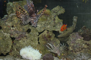 troubles... Bob Fenner> tank setup, Lions, sys. reading 1/26/08 Hello, I really enjoy lionfish and I want to set up a predator tank with a lionfish and maybe a few others. Since you guys and girls have more experience than I do with saltwater fish, I was just wondering your opinion on at least one maybe two good tankmates for a Pterois volitans. From what I have read, Lionfish don't move around very much in the daytime, so maybe a fish that was more active would make the tank seem livelier. I was think of a Dragon wrasse, or something of that nature. Also, what would be the min. gal required to keep the lionfish and tankmates and also the filtration recommended. <Posted...> I don't have a ton of money to spend and would like to get a tank setup the first time correctly, so that I don't have to spend more money fixing it later. The finally question would be how large of a tank would you recommend just for a lionfish singly. Thank you! <Please read here: http://wetwebmedia.com/lions&rels.htm and the linked files above. Read on, take good notes... More to all this than you posit here. Bob Fenner> Lionfish poison 10/30/06 Hi to all the crew! < Greetings, Emerson with you today. > I have a little concern about Lionfish stings. I actually tried to find out everywhere how dangerous is their poison, but the same answer shows up: their sting is very painful. What does that mean? < Lions are actually toxic and not poisonous. They are eaten all over the world. > No, I know what it means, but how dangerous is their sting? I have a Pterois volitans, he's still pretty small (3" or so) and I'm taking great care to avoid his spines while cleaning the tank, but an accident can always occur. The problem is that the closer poisoning center around is in the neighbor city in a children's hospital somewhere in that same city. I don't have any allergies, but I'm really concerned about the dangers of the sting. < You really wont know if you are allergic to a Lionfish sting until it happens. > Could it be deadly? < There have been deaths reported from Lionfish, but it is said to be extremely rare. > Or is it ONLY painful? Your help would be more than appreciated! < Most stings are very painful, and treated with hot water immersion to help with the pain. Keep the poison control # handy in case you get stung. > Thanks!! < Most welcome, and have a great day. > Ivan Volitans Lionfish in reef tank ... feeding 6/24/06 Hello Wet Web Crew, I just purchased a 4 inch Volitans lionfish for my reef tank. The only other fish in my 125 is a 5 inch Naso Tang, some shrimp (soon to be prey items for lionfish) <Maybe> and a 5" Protoreastor nodosus. I know I should watch him with my Xenia and Moon Polyps but it has been almost 2 years with no incidents, even my burgundy star is almost 2. I have kept Volitans in other tanks I have owned over the years, but never in a reef tank. I am finding it difficult to feed him the frozen prawn and silversides with all the liverock in the tank. I drop the food in front of the lion but the water flow from the powerheads forces the food to go in between the rockwork. <Make/use a "feeding stick"... attach the food to this and wiggle around in front of the Lion> I have to move rock around with my hands, retrieve to food then basically wave it around in front of him and make him follow my hand until he is up high enough in the tank to eat it. I can get away with doing this for a while, but as he grows I don't think it is a great idea when he grows to be a foot long. I am willing to gut load some damsels and introduce them live for a while. The Lionfish is in great shape, I fed 4 silversides the first night in my aquarium. Its been about a week and my 2 cleaner shrimp and coral banded shrimp are still around. Any thoughts on an easier way to feed this guy? thanks for all your advice. I enjoy reading through the articles on your site. See ya <Be chatting, reading here: http://www.wetwebmedia.com/lionfdgfaqs.htm and the linked files above. Bob Fenner> Volitans Lionfish problem... not reading 5/24/06 Hello Crew, I have had a Volitans lion for sometime now and it has been eating frozen foods like a champ. Well last time I fed it was last week, Monday, and it has not been eating since that day. I feed my fish once a week. I feed the lion mainly squid but sometimes I will throw in some gulf shrimp, krill, and a silver side. The lion refuses to except frozen food from me now. How long can it go without any foods? <Weeks> It has been 8 days now. Is it best to go back and try some ghost shrimp? What should I do, I hear people say just starve it and soon it will eat but it's been more then a week! Please help I trust you guys a lot. I appreciate your time. Thanks, Ben <Please read here: http://www.wetwebmedia.com/lionfdgfaqs.htm and the linked files above. Bob Fenner> What Kinds Of Fish Do Well With The Volitans Lionfish - 02/27/2006 I was just wondering what kinds of fish do well with Volitans Lionfish. I want a Clownfish, are those ok? Any other fish that you could recommend would be cool too. <Let's narrow this down some. Read here http://www.wetwebmedia.com/lions&rels.htm . Review the related links. - Josh> Spastic Lionfish... lack of info. 2/1/06 Hi Bob, <Vicky> I just got a lionfish and we named him Spastic and for good reason. He's crazy he does loops all day long and then he will float that the top of the tank for so long that I think he's dead. <... may be soon> But as soon as I try to fish him out he goes spastic and starts swimming back and forth and doing loops. He seems to be eating ok and other then the spastic behavior he looks good. We have some clown fish, damsels, and an angel in the tank and they are all fine and do not show any of the behavior that Spastic does. Any advise? Vicky <... read on WWM re Pteroine systems, health... Bob Fenner> Lionfish killing 12/29/05 Dear Sir, We started a saltwater aquarium about 3 weeks and have 2 clown fish, yellow tang, choc chip starfish, and a lionfish. 