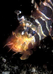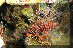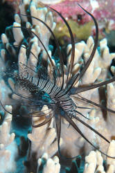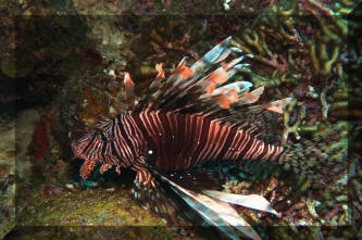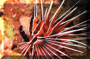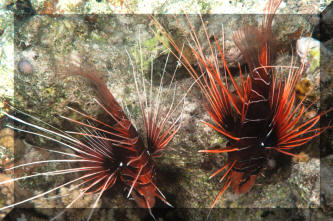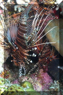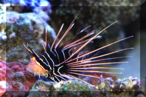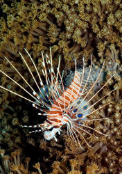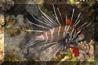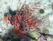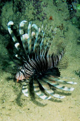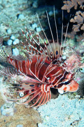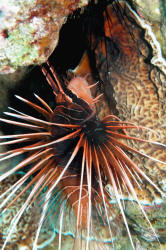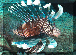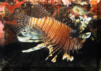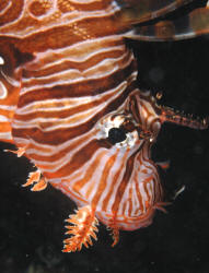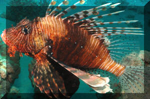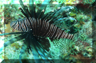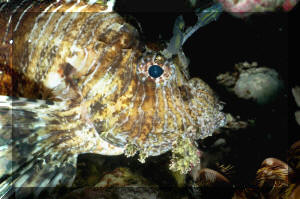 The marine aquarium hobby and service business would definitely be poorer were it not for the Lionfishes. They are the archetypal 'stock' captive fishes. Hardy, readily available, second only to damsels in accepting disastrous water conditions. Able to be trained to accept almost all types of foods and amongst the most disease resistant of specimens, lions are, would seem to be the best of captive aquatic life; and they are. Except for the very real probability of getting stung by their venom bearing fins by being careless, the only downside of lionfish keeping lies in picking out healthy individuals and not overfeeding them. The Various Lionfish and Related Groups Lionfishes are members of the scorpion- or rockfish family Scorpaenidae ("Score-pea-nah-dee") a group of fishes important to humans as food fishes and sources of envenomation (the subfamilies Synanceinae, the Stonefishes, and Pteroinae, the Lionfishes, among others). The non-toxic, but still very spiny rockfishes, in the genera Sebastes, and Sebastolobus are prominent table fare, sold as 'Pacific Snapper' in the U.S. though they are not in the snapper family, Lutjanidae. As Billy Shakespeare might say (or write) what's in a name; sheesh. For those few of us into higher taxonomy, you're referred to Nelson's latest edition of Fishes of the World, 1994. Scorpaenids are part of the Order Scorpaeniformes, the 'Mail-Cheeked Fishes', referring to the numerous processes on these fishes gill covers. A brief synopsis here for sake of granting you insights into the breadth of this group, and logical links to pages on the WWM site: Order Scorpaeniformes, the "Mail-Cheeked Fishes", 25 families, about 166 genera, 1,271 species. Suborder Dactylopteroidei, Family Dactylopteridae, the Flying Gurnards. Two genera, about 7 species. Suborder Scorpaenoidei. Contains world's most venomous fishes. Seven families, about 96 genera, 544 species. Family Scorpaenidae, the Scorpionfishes and Rockfishes. 56 plus genera and 388 species. Subfamily Sebastinae, the Rockfishes. Important foodfishes. Four genera, about 128 species. Subfamily Scorpaeninae, various Scorpionfishes. 15 plus genera with more than 150 species. Subfamily Sebastolobinae. Three genera of five species. Subfamily Plectrogeninae. One genus, two species. Subfamily Pteroinae. The Lionfishes and Turkeyfishes discussed here. Subfamily Setarchinae. Three genera, five species. Subfamily Neosebastinae. Two genera, twelve species. Subfamily Apistinae. Three monotypic genera. Subfamily Tetraroginae, Sailback Scorpionfishes or Wasp Fishes. 11 plus genera and 35 species. Subfamily Minoinae. One genus, 11 species. Subfamily Choridactylinae (Inimicinae). Two genera, ten species. Subfamily Synanceinae, the Stonefishes proper. Six genera, ten species. Family Caracanthidae, Orbicular Velvetfishes. One genus, four species. Family Aploactinidae, the Velvetfishes. Approximately 17 genera and 37 species. Family Pataecidae, Australian Prowfishes. Three genera and nine species. Family Gnathacanthidae, the Red Velvetfish. One species. Family Congiopodidae, the (bizarre) Racehorses, aka Pigfishes, Horsefishes. Four genera, 9 species. Family Triglidae, the Searobins or Gurnards. Divided into two subfamilies and three Tribes. Suborder Platycephaloidei, Crocodilefishes, Flatheads. Three families, 23 genera, about 75 species. Family Bembridae, the Deepwater Flatheads. Four genera, five species. Family Platycephalidae, Crocodilefishes or Flatheads. 18 genera of about 60 species. Family Hoplichthyidae, the Ghost Flatheads. One genus, ten species And more I/we'll eventually list and go over like the sculpins/cottids, agonids/poachers, hexagrammids/greenlings... but not today. Back to the Family At Hand: Scorpaenidae: The family Scorpaenidae's widespread importance is reflected in it's many colorful common names: Upside-Down Flying Cod, Butterfly Cod, Turkeyfish, Firefish, Scorpionfish, Zebrafish, Stonefish, Rockfish, among many others. And The subfamily Pteroinae, Aquarium Lionfishes: 5 Genera, 17 Species For our purposes here let's limit the discussion to the Lionfish species important to the pet fish hobby and industry; those of the genera Pterois, Dendrochirus, and Brachypterois. The first genus Pterois (Tare-oh-ease) are considered the "true" full-size lions, with huge pectoral fins, featuring unbranched rays with degrees of connecting membranes extending beyond the body at their insertion. The other two genera are more often sold as 'dwarf' lions. They display smaller, branched-ray pectoral fins with the rays sporting almost continuous membranes. A brief mention here regarding 'other Lion' species. There are several other genera in the scorpaenid family offered from time to time as Lionfishes. For the most part these miscellaneous fishes are not as desirable as the species we will go over here. They are more secretive and far less appealing physically and color and pattern-wise. But, they probably are all venomous. Much more about this later, but it bears re, re, repeating: all Lionfishes are venomous and amazingly easy to get 'stuck' by. Yes, it's painful and may be very dangerous, especially is you have allergic reactions to proteinaceous stings (Stung, interested? See Wound Management for Aquarists). And as regards the 'Freshwater Lionfish' sold in the trade; these are actually Sculpins, family Cottidae, related not too distantly to scorpaenids (in the same Order). For the record, besides not being Lionfishes, they are not venomous, or freshwater. There are some sort-of brackish water Scorpaeniform fishes, like the Bullroats, that do make forays into freshwater, but they are not permanent residents. The Lionfishes You'll Likely Encounter Include: