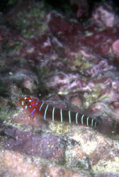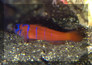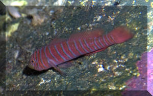 Environment: Due to small size and largely sedentary life habits (along with the slowed metabolism, higher gas solubility of cool/ed water), the Catalina Goby can be kept in small quarters... as little as ten or so gallons. However, for the usual reasons of stability, dilution... and the margins of "error" larger volumes provide, along with the territoriality this species shows towards its conspecifics, a bigger sized aquarium is strongly advised (at least twenty gallons). For a trio or more of Lythrypnus... let me goose you just one more time... and suggest at least a forty... unless you'd like to consider mixing in some other cool/coldwater organisms that require more space.... What sort of physical environment to provide? Like their wild environs... a vertical rocky wall with lots of nooks and crannies. The best would be if you had access to the types of rock along with some of the still-live local biota that are found on and in it. Perhaps a California collection company can be found that will supply your dealer with this. If this is unavailable, base rock can be found, stacked... and this will in time become coated with an assortment of algae. Tankmates: Don't live on the North America continent's southern west coast? Not to overly-worry, there are an assortment of other cool/coldwater species variously mis-offered in the trade as tropicals as well... Look for anemones of the genera Tealia, Metridium (and sometimes Anthopleura), perhaps the coldwater Corallimorph genus Corynactis (want pix?)... various snails like Bubble and Moon... and macrophytes... brown and red kelps that I've seen about... being offered... blindly often... as warm water stock. Otherwise... references abound for searching out the range, tolerance thermal and otherwise of available livestock. Assuredly, warmer water to tropical species will not mix well or long with Lythrypnus dalli. About Chilling/Chilled Water: There are commercial in-line and drop-in chillers to consider of quite a few makes and models... including, thankfully some really neat newer-technology types that don't cost as much as "standard" compression types to purchase or operate (Look up the word "Peltier", thermoelectric coolers)... these last are very appropriate tech. for small marine (or other aquatic) systems. About Selecting Specimens: As you will appreciate, ideally the individual Catalina Gobies that you pick out should be kept in proper circumstances prior to your purchase. If this is not possible/probable, you are encouraged to buy them as "fresh" as possible... talk with your supplier... If they have no capacity for housing cool water organisms for you, arrange to have them order for you and pick them up as new arrivals. About Other Lythrypnus Species... Some More Tropical: There are other members of this genus with similar toughness... and beauty! In particular, from the Eastern Pacific, L. gilberti is often enough offered to make a mention here... and a pic!