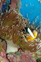 Amongst the dozen or so species of Anemones naturally symbiotic with Clownfishes, the Corkscrew or Long Tentacle, Macrodactyla doreensis gets little use... Is this for want of good looks? Decidedly not, as this is amongst the prettiest colored and physically arrayed of such Actinarians. Perhaps the lack of availability is a factor... it's just not common in its range or at wholesalers... No, this isn't the case. Is it a pure terror, like the Carpet Anemones, eating all mobile tankmates? Not... Could it be that this species gets too large, requires too much light, is too toxic, doesn't eat captive foods...? Mmm, no... perhaps the only downside/negative of keeping the Corkscrew is the need for fine sand of depth... even muck... for it to feel comfortable with. This attractive animal comes in a