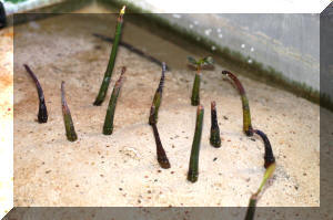 For our aquaristic purposes, we address the red mangrove specifically. Indeed, they are the first species likely to be encountered by aquarists. They are the most commonly photographed for their magnificent aerial prop roots (the arched and exposed knobby knees plunging into the coastline and shallows). And they are by far to the most important genera of this family to marine environments. It is their very elaborate and extensive root system that we must give due regard for in the aquarium. Even a seedling mangrove can develop a formidable root system that can stress or damage glass or acrylic refugiums in as little as three years. We recommend that you pot mangroves in containers and vessels that are as large as possible (to reduce future disturbances of the tree) without making it overly difficult for you to service for transplantation if necessary. Rest assured that growth is so slow (and ultimately managed easily) that these fascinating Angiosperms can be enjoyed perhaps indefinitely in your aquarium system. Although the collection of mangrove trees is outright forbidden in many areas, the harvest of their abundant seeds (known as propagules) is fairly unrestricted on the whole. Un-sprouted propagules look like long green cigars with a narrowly tapered end (where the leaves and branching canopy will sprout from) and a thickened, blunt end (often tinged brown). The blunt end of a propagule is appropriately weighted by design to increase the likelihood of finding its way into a substrate when cast or carried adrift (if it does not have the good fortune of finding itself plunged into the sand from a straight drop from the parent canopy). Note: un-sprouted seedlings can survive out of water in temperate conditions for up to a year. Propagules can be sprouted in fresh, brackish or saltwater and will do so even fully submerged (although this is not recommended for aesthetics and the cultivation of prop roots if nothing else). One thing is certain, though- you cannot move a mangrove between saline gradients quickly if at all! Aquarists are strongly advised to only seek un-sprouted seedlings. If there are any roots or leaves in evidence on arrival, you simply must be told what salinity the propagules were sprouted in. Failure to abide by this is likely to be fatal for the seedling, evidenced by a shriveled desiccation and demise within weeks (the propagule takes on a wrinkled appearance from the "osmotic shock"). After determining the nature and need of your seed or seedling, a serious planting decision must be made. The matter really boils down to long-term plans versus short-term (or open-ended) residence... and the encouragement of aerial roots versus profuse establishment of capillary roots in a substrate. When mangroves are used markedly for the aesthetic, the encouragement of decorative aerial roots is a large factor. One will find that the cultivation of arched prop roots on mangroves is very easy to encourage, or fail to encourage, despite the lack of tide cycles in the aquarium. In the absence of tidal cycles, red mangrove propagules can be trained to develop noble aerial roots by beginning life tied gently with flexible gardener's tape (available at a landscape or garden center) to a thin plastic pipe or rod. Be sure to use flexible tape as a rigid tie otherwise will cut into the plant as it grows. An un-sprouted seedling can then be tethered at a depth where only the lower 1/3 of the propagule (the thick, blunt discolored end) is initially submerged in water. Roots will sprout, incidentally, before leaves will. As roots begin to grow and develop, the body of the plant is slowly moved upwards on the stake. In this teasing manner, strong roots will grow thickened and extensively to support the weight of the body above the water. It will take many months before the body of the propagule can be liberated from the water with and arched and anchored root system. The plant will likely need to be rooted in the future, but only after satisfactory roots have developed above the water surface. If instead you simply stick a propagule into a bed of sand like a dart, root development will occur fast and profusely. However, prop roots are unlikely if possible here at all without a replication of tides and the exposure of some roots to air. Red mangroves will grow in a wide range of substrates but prefer fine sand and muddy sediments ideally. Fertilizing the substrate may be helpful but unnecessary or dangerous in average aquariums where levels of dissolved organics are typically (and nutritively, in this case) high. One exception to the matter may be elemental magnesium; mangroves have been implicated in aquariums as depleting Mg to the point where it skews the balance of minerals. Trace elements may be supplemented deliberately if tested for and monitored. Or, one may simply rely on regular partial water changes for this and contributions to overall water quality. Like most vegetable filters and refugiums, a mangrove basin (aquarium, inline bucket, etc) should be fed raw overflowing water from the display for opportunities to exploit dissolved and particulate matter. It would be counter-intuitive to feed mangroves clean-filtered water given their natural habitat and abilities. Lighting is a simple matter with mangroves. They are quite adaptable to a wide range of light but prefer bright illumination. Expensive reef aquarium fixtures are not necessary however. Common plant bulbs from the local hardware store are quite fine. Many aquarists have grown fine mangroves under incandescent (including mercury vapor and metal halide) plant-growth spectrum floodlights or spotlights. Fluorescents lamps are found in useful spectrums but lack intensity in all but the closest applications with mangroves. Pruning red mangroves is a sensitive matter and rather a moot point for most with consideration for their categorical slow growth in captivity. If you must trim your tree, be sure to resist and pruning until 