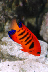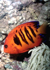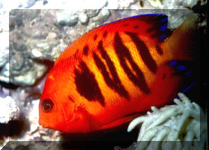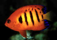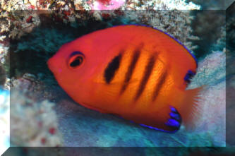Natural Range Scattered reef areas in the tropical central to western Pacific; Hawaii, Society Islands, Australia, New Guinea, Philippines, Guam... Selection: General to Specific It is important at times to stress the danger of (over)generalization; some species of Centropyge are incredibly hardy as a rule, others not so, and in the flame we have a species with a high degree of variability in terms of aquarium suitability/toughness. This relativity is positively correlated with capture, holding, and transport technique/practices which is more or less associated with country and source of origin. Follow me on this: In order of consideration I rank these three arenas in order of importance: First I would sort/discriminate yes/no regarding purchasing a specimen on the basis of: 1) Physical appearance. Under stress these angel species are highly susceptible to Brooklynella and Oodinium (Amyloodinium) infections. The former looks like white, clumpy gunk on body and fins, the latter is typical tan to blackish small dusty-dots over the entire fish. See below under Disease:, concerning prevention and treatment. Torn fins, bulbous eyes, genetic anomalies rule out an individual as well. 2) If the prospective specimens pass the physical appearance inspection, next I examine their behavior carefully(!). Healthy animals are alert, aware of their environment including you. Avoid pale, washed-out individuals, erratic swimming, rapid, shallow breathing and clamped fins. You should not be able to "reach out and touch one" without it seeking shelter. 3) Last in consideration is the "rule of thumb" for origin. The flame is collected and imported from several areas. Hawaii has a limited market in deep water and therefore expensive specimens. The Philippines are a mixed lot with some shipments being exemplary, others absolute garbage. The best, consistent orders I've received directly or not have hailed from Christmas and Marshall Islands collectors. There are more and more new and moving people to buy from. Keep your eyes open. Environmental: Conditions Habitat Size of system: Often touted as a species and group as desirable on the merits of being able to be crammed into small (thirty and less gallons!) quarters, I advise against it. Individuals vary tremendously in their tolerance of tankmates. Close observation and quick reaction to overt aggressive behavior is the rule, even in very large aquaria. Chasing and nipping, especially other dwarf angels, particularly of the same size and/or species, is to be expected; being torn and cowered is to be avoided. Provide lots of caves, hiding, escape-sites. If you have more than one individual or dwarf angel species separate the physical sites into at least two independent "reef" areas. Chemical/Physical Natural or synthetic water with a mid-specific gravity (the low 1.020's is fine. Mid seventies to low eighties as far as temperature. Resistance or at least tolerance to end point nitrogenous poisoning is noted by Campbell. Metabolite removal by chemical filtrants and protein skimming is de rigueur. pH should never drop below 8.0. These fishes appreciate considerable water movement. Turn up those power heads and/or power filters. Filtration Most any type that works is fine; suggested: outside power in combination with vigorous power-head driven undergravel, or better still, a full-on "algae tank" (yes, on purpose) with wet-dry, little substrate, lot's of light, and of course, "liverock" galore. Display Lots of broken rubble with small caves only the angels can get in and out of. Behavior: Territoriality Can be extensive and severe. See notes below re. Introduction/Acclimation The initial minutes to hours of introduction are critical. The same old bag of tricks apply as with generic territoriality: move decor about to disorient resident organisms, feed small amounts of foods frequently, extend the photoperiod (leave the lights on) for a day... Predator/Prey Relations Dwarf angels are known prey items for many larger reef fishes. Hence their inquisitive, alert, darting, secretive behavior and appeal/appropriateness as aquarium specimens. Be wary of placing them with large predaceous species, e.g. big triggers, groupers/basses, Lionfishes... Correspondingly, timid species and eminently chewables (anemones, feather dusters) should not be placed with them as they will become fodder for chase and taste. Dwarf angels are best introduced into communities last or close to it. Reproduction, Sexual Differentiation: This species, and most other dwarf angels investigated, are synchronous protogynic hermaphrodites: They start out sexually undifferentiated, develop into females, and under growth and social stimuli develop into males with one or more females in their territorial harem. Males are typically larger and more and brighter reddened. I agree with Campbell's statement that Centropyge loricula are fine as solitary specimens. They spawn in pairs at dusk in the wild. Actual spawning behavior as per Centropyge tibicen, is described and illustrated in Thresher's article cited below. There is a short "dance", the male first rises then the female, gametes are shed into the environment where they float off to development or oblivion. Inter-species hybrids are known (Pyle). The species has been bred in captivity with some young being raised to small size. Feeding/Foods/Nutrition: Types, Frequency, Amount, Wastes Dwarf angels, unlike their larger brethren are notably not as dependent on sponge materials for nutrition. Algae are very important, making upwards of half their total intake by volume. If you don't/can't provide this by growing in situ, dry, prepared, frozen and fresh green foods have proven efficacious. As your pocketbook and skills permit, some purchased or "cultured" liverock is a very good idea, allowing self-feeding on demand with low risk of pollution. If your dwarf angels lose color, weight, apparent interest in feeding, buy them a piece of algae ridden rock or if 