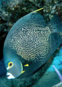 Close: Here we have two Caribbean angel well-suited as aquarium specimens. Other than being overlooked because of being "local", all a French or gray angel requires besides "stock" conditions is adequate space to grow and swim into. Bibliography./Further: Allen, Gerald R. 1979. Butterfly and Angelfishes of the World Vol.2. Mergus Publ., West Germany Campbell, Douglas 1981. Marines: their care & keeping. Pomacanthus. FAMA 9/81 McKenna, Scott 1990. Keeping the flamboyant French angel. TFH 1/90. Miller, Gary 1985. Angelfish of the Caribbean. FAMA 8/85. Moe, Martin A., Jr. 1976. Rearing Atlantic angelfish. Marine Aquarist 7:7, 1976 Stratton, Richard F. 1992 The gray angelfish, Pomacanthus arcuatus. TFH 3/92. Tuskes, Paul M. 1980. Observations on tropical Atlantic angelfish on the Reef and in captivity. FAMA 5/80.