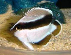 Holacanthus arcuatus Gray 1831, The Bandit, Black-Banded Angelfish, Holo-holo... A beauty and heartbreaker... this angel is so "friendly" it can be caught literally by hand... without a net... but rarely lives for any period of time in captivity. Here's an image of one starting to break down (note brown spot on its flank). Imported from its limited range in Hawai'i. Dr. Randall lists in the genus Desmoholacanthus and Fishbase.org in Apolemichthys... Right: 2" juv. by Matt Ross. Below: Aquarium pic of one breaking down badly and a healthy one in Hawai'i.