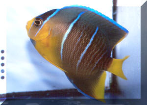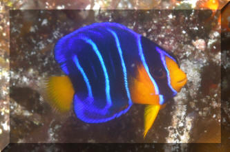 Holacanthus bermudensis Goode 1876, the Blue Angelfish (1). Often confused price-wise with the Queen Angelfish, whose juveniles have bent mid-body bars and adults are much more colorful overall. Hybrids between the two abound. Patchy distribution in the tropical west Atlantic. To thirteen inches or so in length. Below: Juvenile and mid-size adult in captivity, adult off of Florida shown.