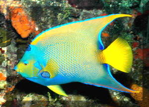 Holacanthus ciliaris (Linnaeus 1758), the Queen Angelfish (1). A true queen of fishes. To seventeen inches in the wild. Florida to Brazil in the tropical west Atlantic. Juvenile (note curved white body bars compared to straight in H. bermudensis) in captivity and adult in the wild (Bahamas) shown. Adults may be yellow, even "koi" mixed in color.