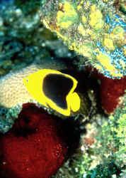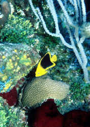 A good general practice is to apply a vitamin and iodide preparation to the system on a weekly basis, and on the fish's foods a good fifteen minutes ahead of offering. Disease, Prevention, Diagnosis, Control Rock Beauties are of two polarized classes. Apparently healthy and doing fine, or quickly dying/dead. If yours should start showing signs of joining the latter group, a cut, scrape... it is likely necessary to move it to a separate treatment system (where it will likely not accept much in the way of foods), check the main/display system for what is amiss (likely water quality), remedy this, and try to treat the fish in the separate treatment facility. Wholesalers and hobbyists have had good results dealing with "breakdown contagions" (red, bloody marks, sores, general malaise) with this species using Furan compounds (typically Nitrofurazone). Full dose, added aeration, water and chemical treatment re-application daily are called for. I and others have had less success with antibiotics like tetracycline, erythromycin. Cloze: Not able or willing to provide an appropriate size, live-rock stocked system for a Holacanthus tricolor? Look to a less-demanding centerpiece/species of the genus Holacanthus then. Perhaps a less-demanding Queen, or Blue if you want something from the tropical Atlantic... or a King/Passer from the eastern Pacific. Or perhaps another genus of Pomacanthids or not an Angelfish at all. I am aware that there are instances in which folks have kept this species in "fish only" set-ups, fed it "nothing but prepared foods and lettuce" and "it's done fine". These are exceptions, rare ones. The Atlantic Rock Beauty is not easy to accommodate, but well-worth the effort. For its care, health, a biotopic shallow tropical west Atlantic presentation/set-up is best. Provide a large biotopic setting, maintain it properly, and culture this animal's living foodstuffs and you will be richly rewarded. Bibliography/Further Reading Bellomy, Mildred D. 1975. Rock Beauty. Marine Aquarist 6:7, 75. Campbell, Douglas. Marines: their care and keeping, Holacanthus-Apolemichthys, parts 1 & 2. FAMA 3,4/81. Fenner, Robert 1998. The Conscientious Marine Aquarist. 432 pp. Microcosm, VT. McKenna, Scott. 1988. Keeping the rock beauty angel. TFH 7/88. Michael, Scott W. 1997. Holacanthus angelfish. Their behavior isn't very angelic. AFM 10/97. Moenich, David R. 1989. Marine angelfish: genera: Holacanthus. FAMA 11/89. Moenich, David R. 1990. Marine angelfish: Holacanthus. AFM 8/90. Phillips, Merry Elisabeth. 1993. A special angel (H. tricolor). TFH