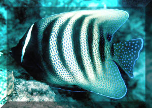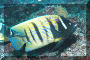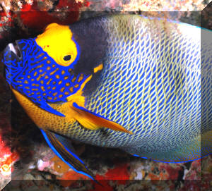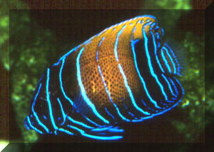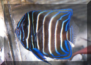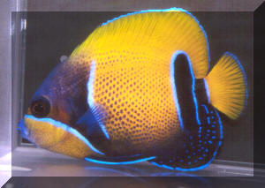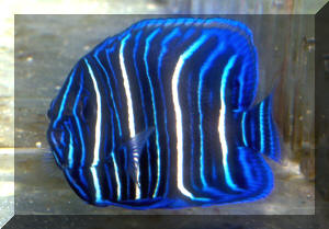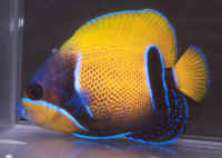 Three of the most beautifully striking of the marine angelfishes are classified as the members of the genus Euxiphipops ("yukes-if-ih-pops"). All but one has an utterly dismal record of longevity in captivity, and yet the other two are regular offerings to the hobby. Prominent reasons for their early demise include poor collection and handling techniques and duration, improper diet, smallish confines, and intrinsic poor adaptability of the plural species. Here I'll offer my points of view on these issues, give you some help on picking out the more viable specimens if you can't be dissuaded from trying the subgenus, and alternatively suggest more suitable members of the marine angelfish family. Classification: Taxonomy, Relation With Other Groups The subgenus Euxiphipops is grouped with other large marine angelfishes within the genus Pomacanthus (Allen 1979, Burgess 1991) (The aquarium hobby however, often lists Euxiphipops elevated to generic rank; don't let this throw you, either one will serve it's purpose for us: identifying which fish is which). The seventy four nominal species of nine genera that make up the marine angelfish family Pomacanthidae should be well-familiar to you. In my estimation some one or more members occupies about half of all marine aquarium systems. Most are gorgeously marked and gaudily colored, with enthusiastic energy and curious, intelligent natures. They are the show-piece rulers of the reef and captive seas. The three species of concern to us here are a little tricky to tell apart at "juvenile-color phase" sizes (up to 3-4"); amongst themselves and a few other Pomacanthus and Holacanthus species. All these have a variation on the theme of "black bodied with alternating blue and white vertical bands" going for them. I have seen all three Euxiphipops sold as "Koran" angels, Pomacanthus semicirculatus, for example. Take a good reference work with you when purveying what's to be had. Adults are so distinctive that I'll save space and time here in trying to describe them in deference to the magnificent photographs shown. The Majestic, Navarchus: