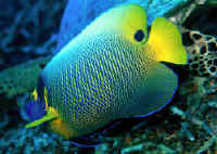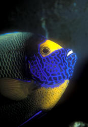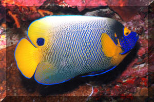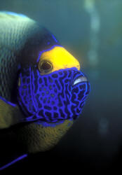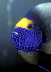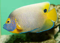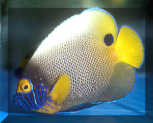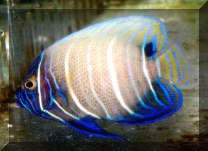 2) The source counts too; avoid ones from their principal sources, the Philippines and Indonesia. Both countries rank as poster children for "not ready for prime time players", still condoning cyanide and other non-sustainable collection of marine livestock, including these fishes. Pay the slightly higher price for a real (viable) specimen from elsewhere; the short-lived ones from Indo and P.I. aren't worth the risk or endorsement of such nefarious practices. 3) Eating; is it? This is a major pitfall with these Pomacanthids, especially smaller specimens. Have the animal demonstrably fed in your presence, on foods you can and intend to supply, then leave it. Come back a few days later for a repeat performance. A cyanided specimen may not take food, or maybe try just one last time. Overly cautious? Perhaps, but for an expensive purchase well warranted. 4) Marks, especially reddish raised areas and spots are a danger sign of impending or current infection. Don't even think about buying these specimens. Collecting Your Own Notes of Note: Almost all Euxiphipops angels are caught by one of the following three methods; a combination of fence and hand netting, "Cowboy-Banzai" hand netting, and poisoning. The first is the worldwide standard of a determinate width and height invisible barrier in which prospective catches are "driven" by divers and hand-netted from. The second works with these angelfish species because they are more curious and casual than most Pomacanthids (perhaps with the notable exception of the super-easy "holo" or bandit angel, Desmoholacanthus arcuatus of Hawaii); they can be caught "on the fly" with two hand nets or one and a "poker" chaser rod. The last we'll mention to emphasize that you want to avoid them; specimens collected via cyanide. These doomed individuals are often unnaturally brightly colored, finnage "perfect" at the dealers, and very approachable; that is, they don't move much. Ahem, if you can reach into the tank and touch the fish without it evading you, you don't want it. Is this clear? Environmental: Conditions Habitat Chief consideration must be given to size of the system and provision of physical break-up, i.e. decor. These angel species do get large, but even when small only do well where provided lots of nooks and crannies. A minimum tank of one hundred uncrowded gallons is required. Chemical/Physical A stable, optimized environment is the ideal for most hobby species of marines; Euxiphipops angels are no exception. They do best in higher pH's (7.8 plus), with little metabolite detectable (as little nitrate as 10 ppm is a good target). These fishes visibly brighten up after water changes. Filtration As you might surmise for such large, active fishes with so much rock and coral decor, you want to have an oversized circulation and waste-handling system. If not a sump-type arrangement, a bonus size outside power and/or canister filter set-up, with, of course, a functional protein skimmer. Behavior: Territoriality Euxiphipops are mainly agonistic toward members of their own and subgeneric species. Therefore, one member of the group to a tank. Oh, and if pushed or extremely stressed they can bring their built-in saber of a opercular spine into blazing action toward tankmates and your hand. Introduction/Acclimation It's best to place these angels near last in a well-established tank, turn the lights off, and observe them CAREFULLY to make sure they're eating ASAP and ongoing. Predator/Prey Relations Large fishes may try to engulf your new angel if there is sufficient size difference, but this is actually quire rare. Reproduction: To paraphrase Thresher (1984), as yet little is known of this genus/subgenus' reproduction. Feeding/Foods/Nutrition: Types, Frequency, Amount, Wastes Stomach contents analysis of wild specimens shows these fishes to be quite omnivorous, browsing widely on benthic invertebrates (worms, mollusks, fish eggs, sponges...), algae, and more. Getting them to start and accept food in captivity often proves difficult. My advice is to continue with whatever foodstuffs your supplier was utilizing, expanding offerings to include as much variety of fresh, prepared frozen and dried matter as you can. Soaking food with supplements including vitamins and appetite stimulants is encouraged. Other writers list shrimp species, squid, open shellfish, spinach, prepared sponge-containing products, live rock, and more as suitable foods. Disease: Amongst angelfishes Euxiphipops are some of the most disease susceptible, and what's worse, least-responsive to conventional treatment. Keep your eyes first and foremost on your arrow-head angel as it will tell you of an impending outbreak or loss of water quality by infection, color loss and behavior. To wholesale dealers and transhippers I ask you to consider preventative ph-adjusted freshwater dips with or without copper and/or formalin bathing to preclude parasitic transmission and further debilitation of specimens of these and other large angels. Alternative Pomacanthids of Size: When I think of all the much more hardy Pomacanthus ( Emperor, Koran, French, Gray, King...; the Holacanthus ( Queen, Blue, Clarion, Passer); and members of Chaetodontoplus that are just as graceful and pretty, and far better survivors in aquarium conditions... I wonder why folks throw their money away on Euxiphipops species. Maybe most just don't know their poor track record, perhaps they're out for the challenge. Well, at least you have my ideas on optimizing your chances with them. Close Not for the slight of patience, experience or pocketbook, the three species of Euxiphipops should only be attempted by folks who have their eyes "wide open". Even given that you pick out a good specimen, provide it adequate shelter and foods/feeding, most of these angels will perish within a few months. Better still for all parties to realize the shortcomings of this admittedly beautiful subgenus' members, and go on to other gorgeous marine angelfi