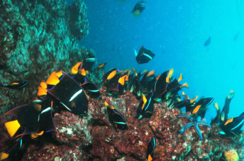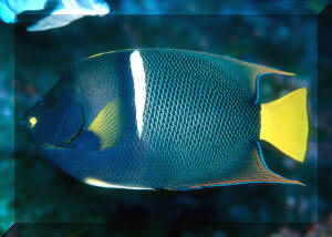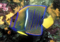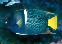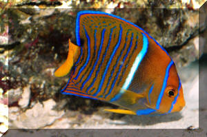 Clarion angels, Holacanthus clarionensis are almost identical to Kings' in color and markings with one notable exception; the head of the King angel is yellow and the head and tail of the clarion is bright orange. Adult clarions add up to their naming, they are brilliant to glowing orange trimmed with bright blue. Location, Location, Location The King and Cortez angelfishes are found from the Upper Gulf of Baja on down the coast of the tropical eastern pacific. The clarion angel is more restricted, observed occasionally near the southern apex of Baja, Cocos Island off Costa Rica and Clipperton, but most often collected from the volcanic islands collectively called the Islas Revillagigedos, @250 miles southwest of Baja. The Sea of Cortez, for all you geography bugs is the southerly extension of that troublesome earthquake-consequent split, the San Andreas Fault. Size: All three of these angels achieve about a foot in total length, and need room to grow in anticipation of largeness. Most individuals offered are in an appropriate range of two to six inches. Selection: General to Specific As for all fishes, select a well fleshed specimen; one without a thin head or pinched belly. Hold out for an individual that's not too small (less than two inches) or too large (generally about half a foot). Other than blatant signs of ill-health, i.e. torn fins, poor color, obvious disease effects, the most important consideration in screening possible purchases is their behavior: friendliness and eating. Happily, these species are collected in areas and by means that exclude poisons and explosives. They are typically, extremely hardy, indeed outgoing, even on arrival. For those only acquainted with damaged and jet-lagged Indo-Pacific angels you're in for a pleasant surprise. The question of whether and what your specimen will eat must be addressed before buying. Ask that it be fed in front of you, place a deposit, if possible and come back a few days later to see feeding re-demonstrated. This is sage (and very expensive) advice for the acquisition of any big dollar livestock. Collecting Your Own Can be done if you find yourself in the area. You need a fishing license of the country in question, the requisite gear for catching and transportation and to remember the "magic words": "for your personal consumption" (that is, not for sale to others). The most productive technique is to follow an individual until in holes up in the rocks and "spook" it from the site with a "poker" into your well-positioned net over the most likely exit. Environmental: Conditions, Habitat These are rocky shore "reef" fishes, so provide as many nooks and crannies as possible. All your specimens will be happier and healthier. Chemical/Physical: The alkaline reserve and pH of the system is a good indicator of overall water quality. Keep the latter above 8.0 by frequent, partial water change and you will not go wrong. Temperature and specific gravity are not critical issues with the amigo angels; these are variable and range widely in their wild environs. Filtration: May be important. These are large, active messy-eaters and defecators. More water motion than less is advised. Behavior: Are you looking for fishes with personality? You've found them. Can you spell individual? In a matter of days your angel will have the tank and you totally wired and figured out. Territoriality: These angels are feisty with other members of their own kind, other angels and other similarly marked fishes. They are solitary and fiercely territorial on the reef as adults so be forewarned. Either one to a tank, two with a large size difference and/or plenty of hiding spaces. As usual, there is no substitute for your own close observation. Introduction/Acclimation: Should follow standard operating procedure with the following admonitions: 1) Watch your specimen, 2) Watch your specimen, 3) Watch your specimen. For what? That it's not getting too stressed-out from being in quarantine alone. That it's not chasing or being chased to death. That it's eating. Do run incoming specimens at least through a freshwater bath to knock down undesirable microbe and parasite introduction. Reproduction, Sexual Differentiation/Growing Your Own: None of the tres amigos angel species has been spawned in captivity, but some of their kissing cousins in the Atlantic have. They apparently form pairs and have been observed spawning seasonally in similar manner; gametes shed in unison toward the surface, planktonic eggs floating with the current. See Thresher and Stratton pieces offered in the bibliography for more. Feeding/Foods/Nutrition: Types, Frequency, Amount, Wastes Like most of their family, these fishes are grazers and pickers. In the wild they consume small organisms; sponges make up the largest part, with worms, sea squirts, corals and their relatives making up the bulk of the rest. Smaller angels eat a considerable amount of algae and are known to be facultative (take it or leave it, i.e. non-obligate) cleaners, removing parasites and necrotic tissue from other fish species. Most individuals of these three angels can be successfully trained on easy to procure foods. Frozen pet-fish mixes, fresh aquarium and "human"-grade seafoods such as shrimp, clam, mussel, etc. and vegetable material from the oriental food section to frozen peas (sans additives). Having some growing material in the system itself is ideal, and these angels will munch most everything in a reef set-up. Some writers suggest less frequent intervals, but I'd offer something twice a day for all sizes of angels. Disease: Infectious, Parasitic, Nutritional, Genetic, Social As members of their genera go, these three are tough. If they seem lethargic or grungy, I'd suspect diminished water quality first (and do a water change) and aggression second (did I mention you should keep an eye on your angel?) Manipulating salinity, raising pH are often enough to correct any apparent malaise. Bad cuts and secondary infect
