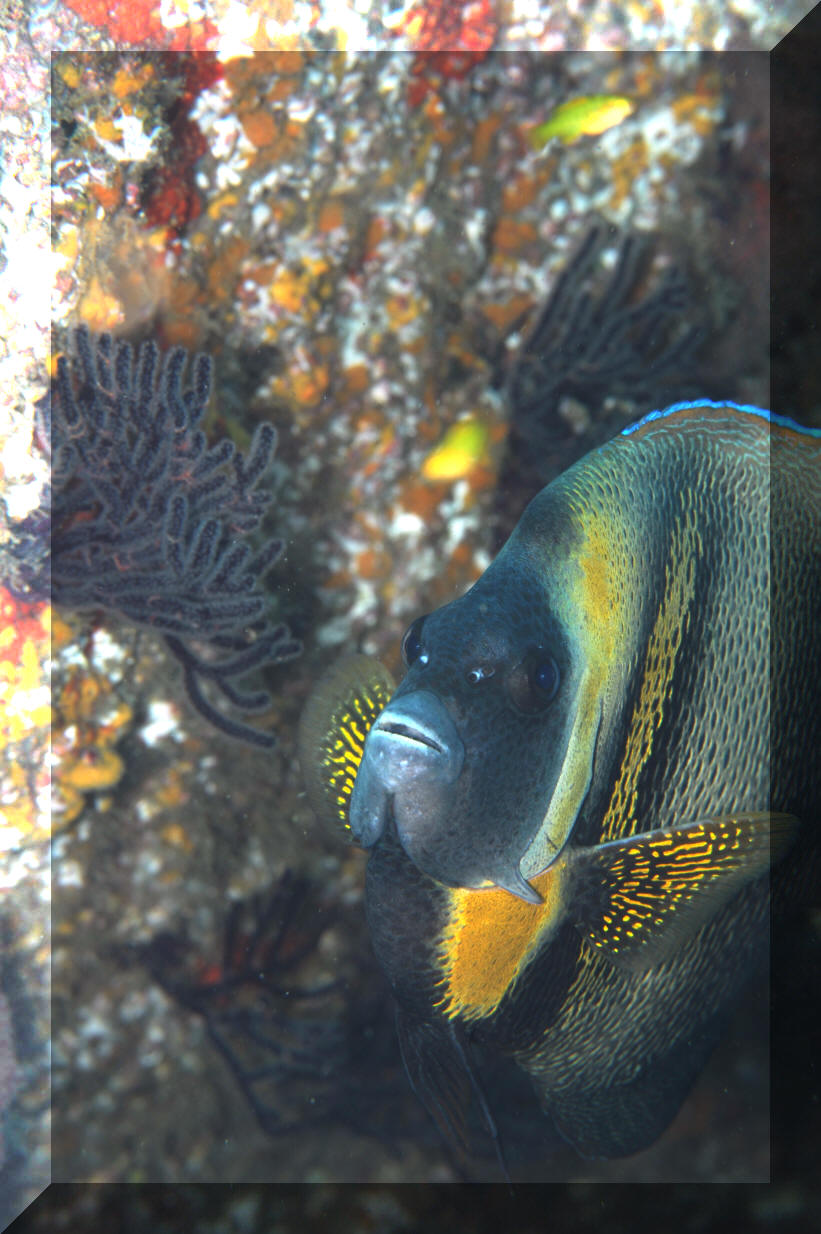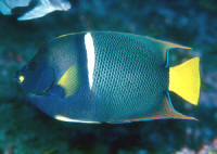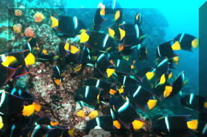 Three striking angelfishes, two of moderate cost, one astronomical, hail from the Sea of Cortez (aka the Gulf of California) and further south. These amigo species are spunky and hardy, making good personality/center pieces for larger aquaria. Their habitats, behavior and nutrition are similar enough to allow us to discuss all three together; and all are increasingly available to the hobby in the West. Classification: Taxonomy, Relation With Other Groups The angelfishes (Family Pomacanthidae) and closely related butterflyfishes are not as well represented on the West side of Mexico as on the East: These families should be very familiar to you. Many of their members grace our marine aquaria; and rightly so. Several species make undemanding, sturdy captives, accepting prepared foods, resisting environmental, infectious and parasitic disease, being beautifully marked and behaviorally extroverted. Look at the photos of the three angels offered here. Don't they look awfully similar as juveniles and adults to those on the Caribbean side of Mexico? Oh, it just seems like a million years ago the isthmus which is Central America was below sea level... the semi-matching East-West look-a-likes are termed sibling species. The Players: The Cortez angel, Pomacanthus zonipectus (Gill, 1863). Compare with the sympatric Caribbean species, the French angel P. paru and gray angel P. arcuatus. Undergoes a striking color transformation juvenile to adult; young with alternating yellow and iridescent blue curved bars, with age replaced with brownish-gray background with broad yellow and black bars. The King (as opposed to the Caribbean Queen) or Passer (as in the bird, sparrow, not passer's) angel, Holacanthus passer Valenciennes 1846. Young have a series of alternating light and bright blue bars with a broad band of orange-red behind the eyes. Compare with the juveniles of the queen (H. ciliaris) and blue angels of the Caribbean.