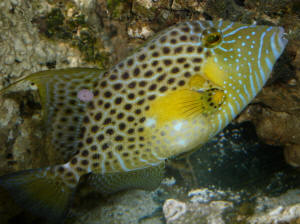 You know the members of this group by their general body plan. Laterally compressed, rough, plate-like skin, square-tailed, with three dorsal spines that along with their distensible underside help them "lock" themselves in places where you and I can't pull them out. All have canine like teeth for crushing and if you're interested 18 vertebrae.