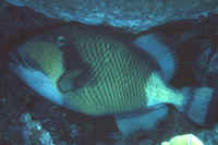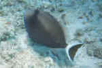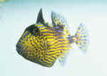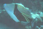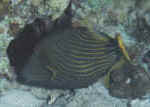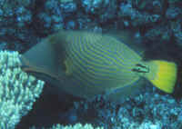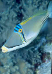 The last seven species are offered from time to time collected from Saudi Arabia and/or Sudan. Due to higher costs of holding and transport, triggerfish with Indo-Pacific range that you see at your dealers are much more likely to hail from the Philippines and islands of Indonesia. So why would or should you be tempted to spend more on the same species from the Red Sea? Three principal reasons; 1) They're more attractive, 2) Tend to be more "mellow" temperament wise, and most importantly 3) Are hardier than the same fish found anywhere else. Call it "the mystery of the Red Sea", better, more careful collection, holding and shipping techniques, whatever you'd like; most livestock from this area is better. A few personal comments about the better of the available Red Sea species. The two Pseudobalistes species get big, fast, about two feet; they are on the mean side of the curve. The niger and undulated triggers are bad boyz from other places in the world. In spite of this, the Red Sea ones are far easier-going. The Rhinecanthus here are medium in temperament and deviation of the same. Lastly, the Sufflamen genus, contains the areas least aggressive triggers. Size: Most species are in the half to a foot range in length, with a few getting to over two feet long. Looking at them sometimes as an unwelcomed diver, I can assure you that some seem a lot bigger than that. Irrespective of size these fishes are tough customers. Selection: General to Specific The point regarding individualism needs to be re-emphasized; the majority of Triggerfishes are territorial and by human standards seem outright mean! Be leery of generalizations regarding this group; amongst fishes they demonstrate a high degree of complex and learned behavior, along with an enormous range of individuality, Each specimen is different. Should you even acquire a trigger? Even small one's can "turn mean" so I am only suggesting that aquarists with some capacity for separating an antagonist (a "spare", hospital, quarantine tank, serious divider) attempt one or more triggers. Because of their indiscriminate "sampling habits", Balistids are for "fish only" systems. I know there are some who would argue with me about the latter issue; and have kept triggers with corals and more, but I caution the initiated against this. The following criteria are what I'd select for: 1) Friendliness. No, you don't need to risk a finger shaking fins. I'm referring to the fish's interest in it's environment. Is it out, swimming, checking out the system and you? Good. 2) Feeding: Yes, the old standby measure. A trigger that doesn't eat is rare, and trouble; let it by. 2) Size; Try to get triggers that are smallish, 2 to 3 inches or sol they more adaptable, easier on tankmates and to train on prepared foods. Unfortunately Red Sea imported fishes shy on larger sizes. 3) Damage; I wouldn't be concerned about an individual with fins that are slightly torn or that appears thin. Cloudy eyes, open wounds would disqualify a purchase but otherwise triggers are tough and readily repair. I urge you to take proper precautions when transporting these fishes. First, don't use your best nets, they'll soon be bit through. Better to direct the intended into submersed multiple thickness bags or specimen container/filter box. Use a Styrofoam box, clean cooler or large fish bucket to move the bagged specimen in, due to vigorous biting and spinning. Environmental: Conditions Habitat You should provide what the triggers are found around in the wild; plenty of rocks, caves, other decor for hiding and play spaces. Take care to stack heavy objects well; your trigger will be doing some re-arranging. Chemical/Physical Though triggers are husky, messy feeders they appreciate good water quality. For former Red Sea inhabitants temperature's in the high seventies, a high pH value (8.2-8.4) and higher specific gravities than many people keep for fish-only systems (1.025). Vacuuming your gravel during frequent, partial water changes, ideally once a week is a very good idea. Filtration Triggers aren't as susceptible as most other marine aquarium fish groups to nitrogen "burning". They've actually been used in other countries to establish nutrient cycling. Regardless, your system should have vigorous circulation/macro-filtration; a wet-dry, large outside power or canister filter, not a soon-to-be-uncovered undergravel filter alone. Behavior: Territoriality This can be a/the big problem with this group. Do not crowd triggers! And make sure they're adequately fed. Either lacking results in less colorful, sulking or bullying fishes. Slow, unwitting species are not good mixers with aggressive triggers. Lionfishes and eels, for instance, are often subject to biting trigger taunts. Introduction/Acclimation Don't be surprised that your new specimen hightails it for the darkest, least accessible cranny on introduction. Allow a day or so's respite; you'll soon find your trigger out and about, checking out what there is to see; growing to recognize you and the feeding repertoire. Predator/Prey Relations Triggerfishes are occasionally reported as stomach contents items for top predators, but typically, other species are on food-chain receiving end of trigger sampling, particularly non-vertebrates. Balistid tankmates therefore must be chosen with care. The bigger basses, surgeons, puffers of various sorts have been placed together with good success. Feeding/Foods/Nutrition: Balistids eat most anything, of food value or no. Cut fish fillet, shrimp, clams, aquarists' hands. Triggerfishes have powerful jaws with formidable dentition; watch your fingers. I suggest substantial once daily feedings for medium sized triggers, more frequent for small fishes. Disease: The Triggerfishes are susceptible to marine "ich" and "crypt", but respond well to and have wide tolerance of common treatment modes. Livestock from the Red Sea is singled out generally for high and constant specific gravity, but the triggers do n