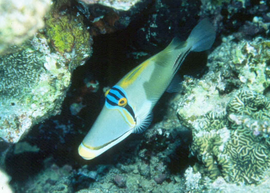 The Triggerfishes are one of the most readily identified, best known and least understood of marine fishes. Their status as bad boys is not altogether undeserved; trigger big-headed and toothiness is all too obvious. As far as behavior, each species and individual must be considered with cynicism; "will or won't this swimming biting machine turn on it's tank-mates?" Triggers as a whole don't deserve our avoidance; in particular the ones that are more and more available out of the Red Sea. Even if not endemic (only found there) these specimens tend to be more mellow, and are more colorful than their con-specifics of the broader Indo-Pacific. Classification: The family of Triggerfishes, Balistidae, are mainly an assemblage of shallow water marine fishes, Atlantic, Indian and Pacific Oceans, of about 40 described species. Balistids are characterized by laterally compressed, ovate bodies, lack pelvic fins, have a first dorsal spine with locking mechanism (the second smaller spine making up the actual "lock"). Taking a look at their mouths, the upper jaw is not protractile, and bears two rows of protruding incisor like teeth. The fins they and their relatives the puffers use for locomotion, the soft dorsal and anal fins each have 25-50 rays. What can seem really buggy, their eyes can be independently rotated. Red Sea Trigger Species: There are thirteen species of triggers reported for the Red Sea area, only one of which is endemic. They are: