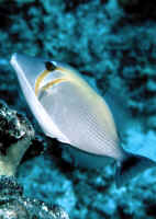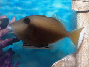 Juvenile white tail... trigger... ID, comp. 9/13/07 Hi Bob and all at WWM! <Howdy Phil!> Always a pleasure to visit your site. I recently bought a baby white tail trigger, about 2 inches long, purported to be a Sufflamen chrysopterus, but it has a complete white border around its tail. Does that indicate that the specimen is a Sufflamen albicaudatus? <Mmm, yes, likely so> Also, I know the adults of this species are sexually dimorphic (males have more blue in their throat area, I understand), but is this feature present in juveniles, or does it appear later as the fish matures? <The latter... and faint at first> My specimen is just a dark gray brown on its dorsal half and cream-colored on its ventral aspect. Lastly, how suitable are Sufflamen for reef setups? <I rate them highly... always found in association... don't seem to be quite as adventitious as other genera... in "trying" sessile invert.s> My trigger is rather docile now because he's so tiny, but can they coexist with mushrooms, anemones, and other sessile invertebrates? I realize that crustaceans are always dicey. Best wishes, Phil S. <I do give you good odds of all getting along here... with food training of the trigger from such a young age especially. Bob Fenner> Bursa trigger, sel. 6/30/07 Hello all at WWM! <Phil> I am a former marine aquarium aquarist, <"Come on back to the fold"> getting back into the hobby after a hiatus of a few years. I saw a nice 4.5" true bursa trigger (Sufflamen bursa) at my LFS. As triggers go, I have heard that they are a little on the smaller, more docile side, relatively speaking, so I'm thinking it might be a good candidate for my new FOS. <For one of size, yes... relative to most Balistids> I like their color scheme--attractive, but not garish. Any thoughts or input would be greatly appreciated. Love your site! Best wishes--Phil in Lancaster, PA ... <Ooh, near the fab TFP retail outlet> <Thank you... Do please send along a/the "rest" of your intended stocking plan, perhaps some particulars re the size, shape, make up of this system. Cheers, Bob Fenner> Adding A Whitetail Trigger - 12/24/06 Today I purchased a 2-inch Whitetail Trigger for my 165 gallon FOWLR. <<Neat!>> I probably have somewhere between 150-200 pounds of rock. <<...! What about "room for the fish?">> Counting the trigger my tank has 7 fish total, and I'm not planning to add anymore. I have a pair of Black-White Clowns (2 1/2 to 3 inches), a Half Black Dwarf Angel (3 inches), a One Spot Rabbitfish (5 inches), a Swallowtail Large Angel (4 inches) and a Yellow Tang (5-6 inches). I have always wanted a trigger, and have done quite a bit of reading, but would like to know your opinion. All 6 have lived rather peacefully in my tank for over a year. Did I make a mistake? Thanks! <<Well Scott, I'd rather see you "finish" your research "before" you make a purchase...but in this instance I think you will be fine. Sufflamen albicaudatus is considered a rather peaceful species...as triggers go...though I'm sure you are aware all fish are individual in their temperament and this is no "guarantee" all will be well. One thing I would like to state...you may want to consider removing some of your rock to give these fishes more room to roam about. You can look to ancillary filtration such as a fluidized-bed filter if you determine more bio-filtration is needed after removal of the rock>> Scott Mickle <<Regards, Eric Russell>> Blue Throat Triggers in