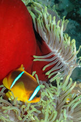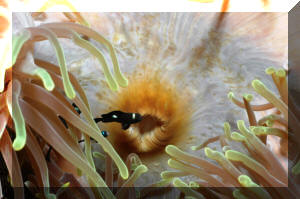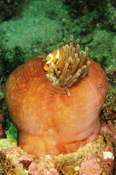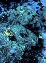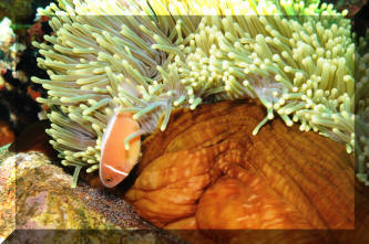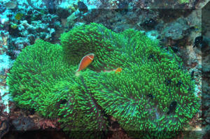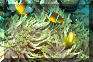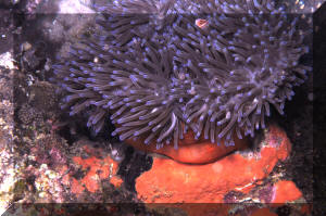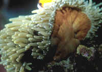 Compatibility: At least twelve Clownfishes naturally form symbiotic relations with the Magnificent Anemone; the rest may or may not in captive circumstances. The best means of introducing parties is to place the anemone first, allow it a few weeks to settle in... Then the clowns, ideally as immature individuals... If you have tank-bred stock or otherwise "clue-less" Clowns that don't either seem to recognize the hosting anemone for what it is, one trick that has proven useful is to place a plastic "Clown shaped" (yes, even though it doesn't move... and it's green in color!) in the tank, stuck with its suction cup on the glass... near the anemone. Often this "sham" competitor is all it takes to nudge the "free agents" to partnering up.
