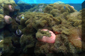 fishes (likely one species of clown and the Domino Dascyllus)...