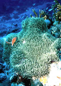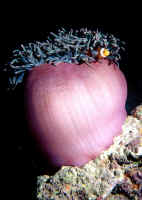Amongst the several large Pacific Anemones naturally symbiotic with the playful Clownfishes (subfamily Amphiprionae), the Magnificent (Heteractis magnifica) ranks near the bottom for inappropriate aquarium use. This is a naturally large (only second to Stichodactyla mertensii in potential size for symbiotic anemones), species that is given to frequent moving... even "ballooning", filling itself with water and floating off to have adventures... Too big and free-roaming for anything but huge hobbyist systems (hundreds to thousands of gallons) with little other stinging-celled life. Want more? Of Anemones the Magnificent requires about the most intense lighting and water movement... and let's top it off with this species propensity to eat your non-hosted aquarium fishes! Nonetheless, this species does make it into aquarium markets and