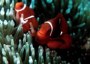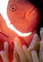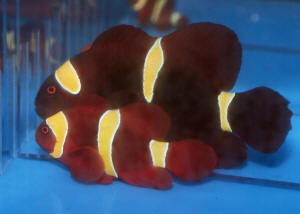 What about the "yellow stripe" versus "white stripe" Maroons? These are the same species... and in fact, though they tend to stay one or the other, can and do change in the color of their banding on the basis of nutrition. Behavior: See Territoriality Maroon Clownfishes can be, become outright MEAN... particularly if crowded, especially if placed with other fishes, clownfish species included, that will not "back down", recognize their obvious superiority. Some folks try to diminish this tendency to "rule all" in their Maroon tanks with the addition of anemones, more decor... this almost NEVER works. About Cnidarian Symbionts & Tankmates: Maroons will take on a number of other organisms (and inanimate objects) as symbiotic hosts.... most naturally, the Bubble Tip Anemone, Entacmaea quadricolor is well-matched with them... and the matching of captive produced fish with captive produced anemone is especially sweet. Of all Clownfish species, Maroons are likely the very most changeable, flexible in their behavior, but also the downright orneriest as well. They can easily take on even larger triggerfishes, puffers, basses... and tear up hexacorallian tankmates... corals and anemones especially. The key descriptor in their intelligent care is "keen observation"... You must keep your eye on them, lest they "go ballistic". It is highly recommended that you intentionally place your Maroon/s last or close to last as fish livestock AND that they be what you want as the "alpha" fish... Even in tanks of a few hundred gallons. "Oh, I'm going to have a few anemones so I can keep different clowns together..." Think again... often Premnas will "hog" any and all such symbionts. Yes, Premnas will accept "strange bedfellows" like Trachyphyllia (Brain Coral), Flower Pot Coral (Goniopora), Plate Corals (Fungiids), all sorts of soft corals, even faux corals, rocks, powerheads and the like, but they do NOT need these organisms to live healthy, long lives... Tank bred specimens have very likely never been exposed to cnidarians period... and may not take to them in your system. Systems: This fish gets big... nearly seven inches long in the wild, just slightly smaller in captivity, and can be, to put it mildly, feisty with its own kind and other livestock. I would not place a single individual in anything smaller than a forty gallon, or two in a sixty. If mixing a new individual with an established one, it is strongly suggested to separate them for a good week, with a partition or my favorite, a floating plastic colander (spaghetti strainer). Put the "old" one in the colander, allowing the new one to become familiar with the system... AND closely observe them the day of actual fin-to-fin introduction. Premnas do best in "reef" type settings, irrespective of their tenacious personalities and the possibility of their tearing up sedentary invertebrates. They may dig in the substrate, particularly around a host organism/item, but this is nothing to be alarmed about. They greatly prefer a mix of rocky decoration to cruise about in, and your other agile livestock will appreciate this as well... to get out of sight of the Maroon/s. Reproduction: This fish has been spawned many times commercially over the last few decades. Times were that tank bred/reared Maroons were clearly inferior to wild-caught, with less color, some behavioral anomalies and at times, shortened lifespans... Nowadays this is far from the case, and except for folks who don't want to wait to bring up their own small individuals to pair, perhaps reproduce, captive produced individuals are far superior in quality, disease resistance, overall adaptation to aquarium conditions. Pairs of this species... males are much more red, diminutive in size by comparison, can be purchased as such... or if one of yours should perish, another of the approximate size of the lost one may be introduced (within a few weeks to discount aggression). Raising your own broodstock is not hard to do, with the usual approach of acquiring a handful of small individuals and having them "grow-up together"... This requires either a good sized system and/or vigilant observation on your part, to notice pairing behavior and likely removing these... to other quarters.