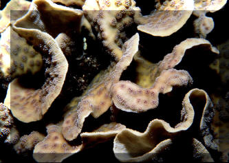 | Echinopora lamellosa (Esper 1791). /COTW: Characters: Colonies are thin laminae arranged in whorls or tiers or, rarely, forming tubes. Stands over 5 metres across are not unusual. Corallites are relatively thin walled and small (2.5-4 mm diameter). Columellae are small and compact, and paliform lobes are well developed. Colour: Amber, pale to dark brown or greenish, often with darker brown or green calices. Similar Species: Echinopora ashmorensis, E. pacificus and E. gemmacea. Habitat: May be a dominant species in shallow water habitats with flat substrates.