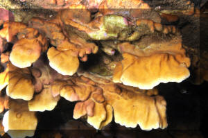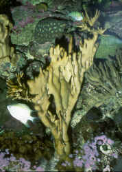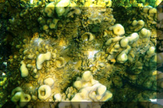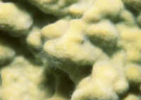 Suborder Milleporina, are the stinging or fire corals. Unlike the Stylasterines, their skeleton is only covered by a thin epidermal layer; and their defensive polyps arise from separate openings that encircle the gastrozooids (feeding polyps). Millepora is the single genus. As you study and observe corals and coral-like animals like the hydrozoans, you'll gain an appreciation for the term polymorphic or "many shapes"; describing the several physical forms a "species" can/does take dependent on nutrient and other growing conditions; sometimes heavily branched and delicate in appearance, other times more blade, fan-shaped and massive. The number of varieties of Millepora are in dispute. Veron states that there are at least 48 nominal species; an unknown number of true species. More to the point for our discussion is the question of "how to tell when you're looking at a fire coral?" period. There's always the touch test; ouch. Most of the time, the colonies are green or yellow-brown (due to endosymbiotic Zooxanthellae) fading to whitish at the tips, and "soft", "hairy" and rounded in appearance. On very close inspection, the arrangement of almost microscopic stinging and eating polyps can be seen (image above). /WA Corals: branching, columnar, submassive or encrusting tiny polyps visible as minute pores • zooxanthellate with stinging cells • member of the Hydrozoa