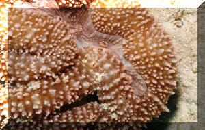 generally greenish or brown, gray, with lighter oral discs; look spiny. Below: Red Sea broken colony and