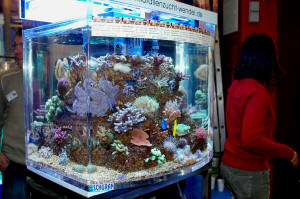So, you say neither spouse nor space will allow for "another fish tank?!?". Is that what's bumming you Bunky? Well brace up and slip this under your boss/supervisor's door: A short piece on the ease and innovation of aquatic environments at... work! What a great idea; release aggression, eye-strain and get your hands wet both day and nights. A growing trend in office design is the use of "living" materials. Atriums with plants and water, live plants, and aquatic environments: ponds, falls, fountains & all shapes & sizes of aquaria are the all the rage. Why not? Living art for your work environment. More soothing than paintings or photos. More intelligible than piped-in music. A tropical saltwater, freshwater or goldfish tank can calm nerves and lend a natural creative edge to the workplace. How can you enjoy the use of the same? The small and large of it: As an interested party, you can become a hobbyist or extend your hobby into the workplace. Wouldn't a nice tank on it's own stand look great in the lobby or your office? Some small hexagonal aquaria, complete with hidden equipment, can be placed right on the corner of your desk. You don't have the expertise or the desire to design, install and keep-up a nice display yourself? No problem. Just like interior-scaping businesses that arrange for living plants, there are water feature enterprises that will produce and maintain a work of living aquatic art for you. New Materials and Techniques: Tanks: Almost all modern aquaria are composed of acrylic plastic; these are clearer, lighter, easier to keep clean & modify and leak-free. Acrylic aquaria can be made in almost any shape or size and heat-bent or solvented instead of glued at the joints. Filters: Have come a long way. Today they're quiet, efficient, easy concealed and cleaned. Due to improvements you can accommodate a system that supports live corals and other reef inhabitants. Other Goodies: Lighting that duplicates the tropical sun, healthier livestock and automatic feeders are just some of the improving technology of aquatic life keeping. Where to find help: Your local specialty fish store, interior designers and aquatic service companies are a good start. Check the yellow pages under Aquarium or Tropical Fish. Discover the reduced tension and habitat-enhancing effects of living art in your work environment; put an aquarium in your office. |