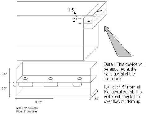 DIY Overflow Hi, <<Hello,>> I've been reading your FAQs since I started my first marine aquarium this year. It's just a 29 gallon tank with a couple fish, some crabs, and just recently 2 anemones. I figure that this is my learning tank before moving on to something larger. I have a Prizm skimmer, Penguin Bio Wheel power filter with a Fluval surface skimmer attached, and a Zoo Med powerhead behind the rocks for extra circulation. Anyway... I just added a new 200 watt Ebo Jager heater (also behind the rocks), and a CustomSeaLife SmartLite to the mix, and I realized that space is getting tight... Because of the light I can't reach the skimmer to adjust the flow without removing the light, and I don't like the heater laying across the bottom of the tank. I realized that I have several 10 gallon tanks collecting dust in the garage, so my natural thought was that it's time to add a sump to my learning experience. That would allow me to move all the mechanical devices below the tank except for the power head (which is the only piece I've really been able to conceal well anyway). I've been looking at overflow boxes, and the ones that are available are way too big for this little tank, and too expensive to boot, since when I do get a larger tank it will be drilled for a sump anyway, so why blow $70 on something that I won't be able to use on a new tank down the road. After looking through the DIY plans online I just had an interesting idea about making an overflow box, and am seeking an opinion as to whether it would be a good idea. I read one of the plans where a person used an old power filter as the outside box. all the parts were gutted, and the hole where the pump goes was used to place the bulkhead for the plumbing. My thought was... Why gut the filter??? Add the overflow box onto the front leaving the filter tube in place so that it's inside the box (cut down if too long), and why remove a perfectly good pump??? Just add a piece of acrylic to divide the media chamber drilling the opposite side from the intake for the bulkhead. Now you have an overflow with a priming pump built in... Just plug it in until the siphon starts, and then unplug... If the siphon breaks you can just plug it in to re-prime it. Any problem with this that I'm missing? <<Only if you forget to unplug the pump... the pump mechanics would also reduce flow when the pump is shut off. Although this is a neat idea, it's probably not optimal.>> Aside from the fact that it would be limited by the diameter of the intake tube, but for a small tank it could be just the thing, and who doesn't have an old power filter or two laying around wasting space? <<True.>> Thanks, Jeff Cowles <<Cheers, J -- >> My crazy clowns (and overflow boxes) Mr. Fenner, I just wanted to give you an update about my 2 true clowns. I wrote to you about a week ago asking for advice about my clowns fighting their reflection in the glass. I am happy to say that they have given up this behavior and have adopted my Green Frogspawn. :) <Ah, good> I have a question if you have the time to look over the attachment I've sent. I have a Del-Ray sump that came with an over flow. It is the box kind that is attached with suction cups and uses a J tube to go down to the sump. I am having problems with it staying attached (the box inside of the tank that is.) <Yes... a poor design> My LFS does not sell these sumps anymore and does not know where I could find out the information about the suction cups used. On a totally different subject I want to purchase another overflow (so I can have one for each corner) and now I cannot find the manufacture (looked on the net and could not find it. I am not a surfer.) Could you please take a look at the picture I have attached and tell me if you know this sort of overflow. and where I might be able to find on like it? <See it... and not made by any extant company as far as I'm aware. Do look at the CPR units... Link on WetWebMedia.com> Also I thought that since I am moving and I will have to take my tank apart, could I use aquarium sealant and glue the box to the wall of the aquarium? <Absolutely... this is what I would do if satisfied with the unit... if not cut, drill the tank otherwise...> I don't ever intend to have them removed, so this seemed like a good idea. What do you think? I haven't found anyone who has done it so I am weary. Have a great afternoon and thank you for your time. ((sorry for the first picture being so blurry)) <No worries... have many more that are much blurrier. Bob Fenner> Re: My crazy clowns (and overflow boxes) Hello again Mr. Fenner, Sorry to give you two emails in one day but I did want to thank you (yet again) for you help. About the overflows, I would like to ask another question. I have heard very bad experiences with the CPR overflows, losing there siphon and other scary things. <Mmm, actually, these makes/models are about as trouble-free as available, and reliable IMO> I have not had a problem with the one I am using now. I would keep using it because I thought drilling a glass aquarium when it has already been assembled is a disaster waiting to happen. <Can be... I wouldn't do it yourself... check around with the glass shops in your area for their opinion) I have heard it has a greater chance of cracking while being drilled and that it could loose structural integrity. <Crack, yes... a possibility. Loss of structural integrity? No, not if done correctly.> The tank I have now is 1 year old and does have a center brace at it's top. Do you think it is possible to drill for overflows and not have problems?. <Yes... this is a "stock procedure" in aquarium manufacture...> I will read over your web site and see if I can find anyone who has done this. I am just very weary at the idea of drilling glass. Best wishes <And leery. Bob Fenner> Overflow Q's Hello Mr.. Fenner- <Anthony Calfo up at bat this time, my friend> Thank you for your prompt response. I have an idea and wanted to have your input on it. I h
