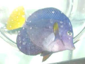 More Parasitic Problems? Some of the fish in my tank started to show signs of ick in the middle of September. <Yuck!> My porcupine puffer, sail fin tang, Misbar clown, and two of my three Cardinals showed signs of ick (white spots covering eyes and body). My Yellow Tang started to show signs of black spots. My Valentini Puffer, remaining Cardinal, Hawkfish, Damsel, and three blennies showed no signs at all. I treated with Coppersafe on 09/21/04 and also used Maracyn 2 for any secondary infections. I was able to net and dip with Methylene blue the Porcupine Puffer, the Sailfin Tang, and the Misbar clown. I couldn't net the other fish because it was causing too much stress in the tank. The Misbar clown and two Cardinals have since died. <Sorry to hear that.> The Porcupine Puffer and Sailfin Tang cleared up nicely and seem to be doing fine. The Yellow Tang continued to hide in the back of the tank and still showed some signs of black spots. On 09/30/04 I noticed that the yellow tang had red blotches along his fin line and on his body. On 10/01/04 most of his fin material was gone and the red blotches had spread. He was having difficulty breathing and swimming. He died within a few minutes. I attached a photo of the yellow tang for you to see. The chemicals in our tank are as follows :PH-between 7.8/8.0, Ammonia- 0, Nitrite- 0, Nitrates- 20/40. The temperature is 76-78 throughout the day. Was this some sort of disease or water quality issue? <I'm leaning toward a disease, but it's hard to be completely certain here.> Should I worry about the other fish catching what the yellow tang had? I don't have another tank to use for a quarantine or as a hospital tank. Any advice that you can give will be greatly appreciated. Thank you in advance, Julie. <Well, Julie, I am a big believer in quarantine and treatment of sick fishes in a separate tank. Even a large Rubbermaid container or other type of container to hold water will serve as an isolation tank. At this point, I'd let the fishes stay where they are, and keep observing for any signs of problems. Sometimes, a rush to treat can be more problematic. Keep calm, observe carefully, and take action as necessary. Good luck! Regards, Scott F.> From Bad To Worse? (Parasitic Disease Treatment) Hi <Hello there! Scott F. here today!> I have a Powder Blue Tang and a large Emperor Angel that I bought a week ago. I put them into a quarantine tank. Two days later they had white spot. I used SERA COSTAPUR, which contains Malachite green. After the 5 day treatment the fish seem to have "skins" over their eyes and sides of their heads. They also seem to have very fine spots, much smaller than white spot. This does not look the same as the white spot when it started. Please help! What can I do now and what is wrong? I thought of lowering the salinity to 1.010. Would this help? Thanks John Squier <Well, John- you could be looking at a more virulent malady, such as Amyloodinium (Marine "Velvet"). The symptoms that you describe could be part of this disease, a secondary infection (the eyes), or even collateral damage caused by the medication. Are the fish displaying other signs of this disease, such as difficulty breathing, listlessness, lack of appetite? if so, you nay very well be looking at Amyloodinium. After you have confirmed that this is, indeed what you're dealing with, then I'd get the fish into a separate tank for treatment with a copper sulphate or formalin-based remedy (copper may be tough on the tang). Standard treatment protocols for this parasitic disease are outlined here on the WWM site. Follow generally accepted treatment methods, and monitor your fish carefully. With quick action on your part, these fishes can pull through. Good luck! Regards, Scott F> Marine parasites Bob! Troubled times... Out of my six marine units, two have ich and one has marine velvet. <No fun... next time, at least pH-buffered freshwater dips... will save you from 99 + % of such troubles...> Would it take a full 4-6 weeks for marine ich to be out of a fallow system when treated with hyposalinity and elevated heat? <Maybe so... if it were me, my shop, I'd "nuke" the affected systems (lightly bleach them per WWM pitches), and re-cycle with some substrate, water from one of the clean systems> I want to condense the fish with ich to one unit, and treat it. I spoke with Dr. Prescott from Fish-Vet and he swears up and down on his "No-Ich", so I thought I'd give it a shot. <He is the real thing, has good products> I thought I could just leave the other unit fallow (and further treat with hyposalinity) so if it doesn't at least one is on it's way to being relieved. Marine velvet...is there anything you can recommend to speed up the process on that unit? <... bleach.> I have the fish QT'd and being treated. How effective is it to dry it out? <Not enough... the causative organism/s can dry, wait out...> I want to be done with this. I can't afford to have two completely empty units, and one on the mend (that's 75% of my fish-fish tanks). I also can't afford to put fish in tanks with parasites. Are there things that can/should be done from a retail display tanks that aren't recommended for home display tanks? <Lots... as you can read for instance in our posted suggestions for acclimation... some procedures are for hobbyists, others for the trade> Since I have taken over the fish department I have started freshwater dipping incoming livestock but we have no established quarantine system. For 1200 gallons of marine retail space, how many QT gallons should we have? <Depends on your volume... if you sell pretty much all every two weeks (a given quarantine cycle) than half the space should be devoted to each> As a retail store how long should we quarantine for? <Two weeks is about right> Also, where is formaldehyde commonly sold? <... chemical supply houses that deal in organics (see your "Yellow Pages"... the trade sells enough volume, sizes of formalin likely for your use (see Kordon/Noval