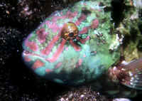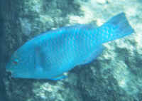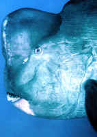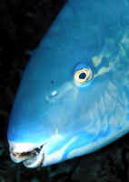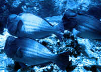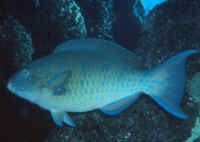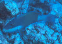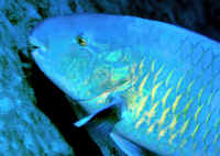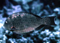 What is it that soars like a parakeet, is as beautifully marked as any butterfly, has a "beak" like a macaw and is a major source of fine coral sand? Give up? It's the Parrotfishes, family Scaridae. This group would seem to have everything going for it as far as desirability to marine aquarists; many are spectacularly colorful, they have almost comical fusiform-torpedo body shapes, and are numerous and easy to catch (at night) as they lay sleeping with or without their fish-made mucus cocoons. Their only downside, and it's a big one, is that Scarids rarely live for anytime in captivity(!); either starving to death for reasons that will become obvious, or "stressing" out to extremes due to other rigors of captivity. Let's cover some of the science and captive maintenance notes of this group to gain appreciation and offer insights to parrotfish selection and care. Natural History: Scarids are all marine, mainly tropical in the Atlantic, Indian and Pacific Oceans. They have non-protractile mouths with coalesced jaw teeth resembling a parrot's beak. Like the related wrasses they sport large cycloid scales, large, thick caudal peduncles (the part of the body right before the tail fin) and broadly truncate (square) caudal fins. According to Nelson (1994) there are currently nine genera with eighty three reliably described species. Due to radical changes in color and markings consequent with sexual stage developments there are many nominal, mis-identified species. I'll try to make this clearer under the "sex and the single parrotfish" heading below. Parrotfishes are closely related to the popular aquarium fish family Labridae, the wrasses. They are collective members of the Sub-Order Labroidei in the largest living Order of fishes, the Perciformes. An interesting higher classification note here for those so inclined; Nelson (94) recognizes the cichlids, Surfperches (family Embiotocidae) and damselfishes (Pomacentridae) as part of the Labroidei as well. See Joe's references in the third edition for further discussion for more. Species of Use/Disuse: Genus Bulbometopon: One species, a big one.