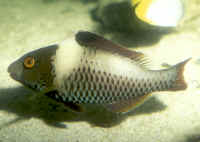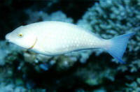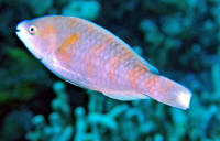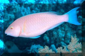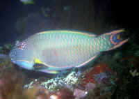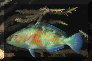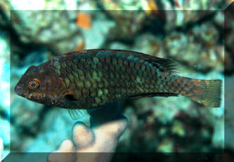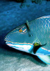 Aquariogenic Stress: Okay, I'll come clean; I made up the word aquariogenic. I'm looking for a term to describe the imposed consequences of captive care in fish tanks; effects that are different in kind or extreme due to aquarium versus wild conditions. You know what we're getting at here; some species, sizes, sexes, individuals do much better in aquaria than others. One way of discerning which varieties may be better for aquaria is observing them in their natural environs. Watching our aquatic charges on the reef yields much valuable behavioral information. Parrots are wide-ranging, sometimes covering several hundred square meters in the course of one scuba-dive observation period. This wide travel may be a matter of searching through enough necessary foraging space; allowing favorable foodstuffs to recover. Obviously, in captivity such large areas are unavailable and apparently exert a dunning effect of parrotfish vitality. They go from extreme extro- to intro-verts, settled on the tank bottom, whereas Parrotfishes are in almost constant search/eating mode on the reef during the day, stopping, "sleeping" only at night. Other Items of Interest: Places I've been to in the world (e.g. Tahiti, Baja Mexico) offer Parrotfishes as regular table fare (see the picture of split-dried parrots for sale in Lombok, Indonesia). At some localities (the leeward side of some Caribbean Islands) people eat them seasonally; in other areas (parts of the Indo-Pacific) parrots are carefully excluded as being a source of ciguatera, food-fish poisoning. Scarid toxicity appears to be a matter of bioaccumulation of poisonous algal proteins. How much substrate do you want to have in your marine system? In the course of breaking off, scraping and pharyngeal grinding coral skeletal material Parrotfishes excrete large quantities, veritable showers of coral sand. I'd seriously venture that the Parrotfishes of the world egest several thousands of tons of such material a day. Amazing, eh? Sex and the Single Parrotfish: Like the wrasses, most parrots have proven to be protogynous hermaphrodites (both functional sexes, females turning into males); but as they say on late night TV. advertisements, "But wait, there's more". Imagine you're looking at all the Parrotfishes on Earth. You have some notion of what a "species concept" is all about and structurally and genetically and biochemically and any-other-else-ally there are distinct (sort of) "types" of Parrotfishes separate from other "types". But color and marking-wise within these species-types there is some widely differing "sub-types". Well, it turns out there are about four, five of these per species. Now follow me here; there's 1) undifferentiated immature individuals, 2) one's that have developed into females, 3) those that have gone through being females and are now males, 4) some that are/were "just" males, and finally, 5) Super males, typically larger, most brightly colored "alpha" types. Though unlike some wrasse species, they don't' change much morphologically (structurally) with sex switching, parrots frequently have striking color differences with different age, social status and gender. Large, colorful supermales must be seen in person in the wild to be fully appreciated. Whew, easy huh? Now you can see where the confusion has come from in accurately detailing whose who species-wise. How do we know all this is so? Some clever weird-science researchers have shot up Parrotfishes with sexual hormones and cataloged their subsequent changes. Ho-boy. That and bunches of diver reconnaissance. Selection: If you're determined to try a member of this family here are my suggestions: 1) Engage as large a system as you can; a hundred gallons plus. 2) The more established the tank, that is, with mature algae growth, the better. 3) Buy a small species; (some get to over three feet in length), at a small size; four to six inches. Three smaller favorites are the queen parrot, Scarus vetula, the spotlight parrot, Sparisoma viride and the bicolor parrotfish Cetoscarus (Bulbometopon) bicolor. 4) Do try to get your specimen as fresh from the sea as possible. The longer the fish stays in transit from the collector, wholesaler, and retailer to you the worse. It's just getting more starved and stressed. 5) Offer a variety of homemade and/or prepared food items along with sufficient fresh material and monitor their acceptance. Open, but leave krill, shrimp, clams, mussels and the like in their shell for calcium intake and tooth wear. Try offering these foods at the "top" of your habitat (coral, rock); this is where parrots feed on the reef. 6) Provide vigorous circulation and filtration as Scarids are avid eaters and prodigious producers of body mucus, especially the species that spin their nightly sleep cocoons; which brings up... 7) Make preparation for a suitable hiding and sleeping space; a nice coral or base rock cave with low illumination. 8) Just get one. They don't get lonely, but may fight and do get big. Usually, you'll end up with a colorful male. 9) Because of their non-competitive nature don't mix with aggressive, food-greedy species like large basses and large damsels. A Conclusion: Most species and individual Parrotfishes are difficult if not impossible to keep for very long under "typical" (i.e. small) aquarium conditions. In the wild they are found continuously roving, grazing stony corals, gnawing and scraping at these dead coral substrates for their algal growth, and generating copious amounts of fine coral sand. In low-volume tanks they waste away, skulking in a dark corner possibly dreaming of happier days scouring the reefs. My advice is to instead seek out and enjoy one of the many hardy, related wrasses. Several varieties of these fare very well in marine aquaria. Leave the parrots to cruise their coral palms, making us more sand. References/Further Reading: Burgess, Warren E., 1981, 82. Parrots of the Sea. Pt. I, II. Tropical Fish Hobbyist, 12/81, 12/82. Nel