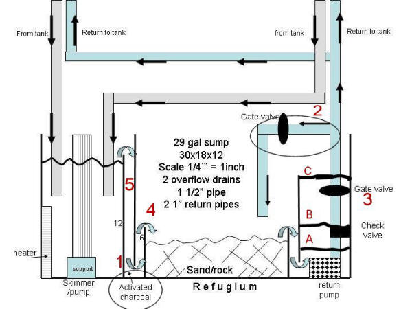 Check over my design PLEASE! True about the water flow. I would like to have 2 overflow boxes one on each side of the tank. <If this system is not yet filled, up and running, I strongly encourage you to have it drilled, fitted with permanent overflows> Then pvc piped to the first tanks. The first tank will have partial filtering and then bio balls. I ended up making the refugium on the weekend. I made it like a pond in my basement. I made it 5 feet by 3 feet by 1.5 feet high. I plan on putting corals and live rock in there after I get everything running smooth. To see. But if I bought crushed coral would it be better in the tank or in the refugium. <Either, both> Then put just sand in the tank? I decided on using 2 skimmers because of this article I read. IT said that you need 2 minutes for a air bubble to fully attach itself to the nitrite. <Mmm, not so... though the more time in contact, generally the better. But fine to have just one good skimmer> Then it said that a 5 inch skimmer is perfect. So I thought that I would go a bit smaller and go with two. Won't hurt to go with two. My biggest question was about lighting. Metal halides are the way to go. I'm thinking 2 MH 15,000k, what other lighting would I need I know florescent. But which ones do you think? Thanks <I think you should be studying... on WWM, elsewhere. Please take your time here... consider lots of inputs... the rationale behind them... make up your own mind. Bob Fenner> Cross brace in the way 5/6/05 Hello, thanks for all the info. <You are always welcome :)> I have a 75 gallon reef ready, it came with only one overflow located in the left corner. The cross brace is directly in the middle of the tank and sits very low. The brace prevent the surface water on the right side from making it to the overflow, so I am left with stagnant surface water on that side. I have tried everything short of installing a hang on siphon (which I don't want to do). <agreed... please don't> Can you think of anything I can do to get this scummy surface water back into the column water so it can be skimmed out in the sump? <the overflows were built too high, and are not easily corrected. Instead it may be better to seal in some thin Euro-style bracing (narrow strips of glass sealed at the top of the tank and perpendicular to the vertical panes). Then... the center brace can be safely cut out> Also, would it cause any problems if I converted the return line coming from inside the overflow box to another Durso (sp) stand pipe? <That is a very good idea> My sump is fed by one stand pipe located in the overflow. My return pump is too big for the single pipe so I have it restricted, losing out on some circulation from the pump. Thanks for all the help. Travis Hunt <best of luck/life. Anthony> Marine Plumbing Hi to everyone at wet web <Hello> You guys do a great job. <Thanks> I am in the process of upgrading my tank. The tank is 1060mm x 915mm x 700mm. I was planning on a sump to house all the gear, a refuge for algae to grow etc, and another small refuge for pods to grow etc sitting on top of the tank. <Okay> With the water coming out from the tank, I was planning on splitting it up so that some of the water went to the skimmer and the rest going into the refuge. I have read that the water from the tank should go to the skimmer first, also read that all the water should the refuge first? <Mmm, you can have go to both first...> confused, can see both sides, is splitting a option? <Sure> once water has been thru the refuge and skimmer it will go to the main sump to be pumped back to the main tank. Does this make sense and will this be ok. <Will be okay> The amount of water coming from the tank is about 5000 - 6000 ltr per hour. I was planning on having the refuge about 12 - 15cm wide x 40cm high x 60cm long, what would the ideal flow rate thru here be? <A few to a handful of actual volumes per hour is about right> The small refuge on top that will flow straight into the main tank. the only purpose for this is for pods etc to grow. I'm I right in saying that it won't need any light, would it be able to have a low flow rate flowing thru, 600ltr per hour? <Could or not> The size will be small, maybe about 10 - 15 ltrs. filled with a bit of rock , sand and a few coral fingers. Thanks for the help Tim <Sounds like you're well on your way on a workable plan. Bob Fenner> Overflow and return pump Dear Bob, <James for vacationing Bob> I recently purchased a 110 gallon tall aquarium. This is going to be set-up as a FOWLR. The majority of biological filtration I plan on is live rock and sand. My question is with the sump. I have a 600GPH overflow and was wondering the size of the pump I should get. I'll probably have at least 4' of head, and I also want to maybe run a few returns. I was reading an article saying that if you want more returns to get a bigger pump. So with this in mind I was thinking of a Rio 3100 or a Mag 9.5. My question is how big? Any specific models are greatly appreciated. <Sam, with a 110 gallon tank, I would want a minimum of 1100 gph going through the system. Of course you can accomplish this by adding power heads along with your sump pump to make up the difference. With a 4' head you will lose a little over 50gph. The Mag 9.5 should work for you. I would put a ball valve on the output in case you need to cut the flow down should the overflow box not handle it. James (Salty Dog)> Help w/upgrade please I currently have a 72 gallon bow front reef tank (non reef ready). I currently have 96 lbs of live rock and 40 lbs of live sand over 50 lbs of aragonite substrate. I am looking to upgrade to a sump/refugium/protein skimmer combo (currently have all hang ons and it's killing me). <Ahh, you'll like the change for sure> Is it possible for me to NOT utilize my cabinet, instead I would like to place the sump/refugium/protein skimmer combo to the left of my display tank almost the same height of my display tank. <Yes, possible> I want to include m