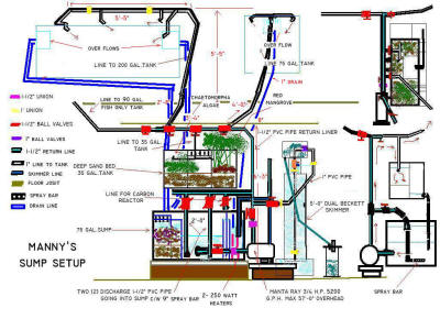 Plumbing in a 50 gallon sump & 25 gallon refugium... Hi Bob, Now that I'm in my new home with all the extra room!!!! yes!!!!, I can get serious about expanding my salt water system. This is what I'm wanting to do. <Okay... am about to add a couple of tanks to our new/used place as well> I have a 55 gallon salt aquarium currently in my office setting next to the office closet...in the closet I'm mounting heavy duty shelving to support my 25 gallon refugium above main tank level to gravity feed main tank in office. Below shelving on the ground in closet, I'm placing a 40-50 gallon sump for skimmer, heaters, dosing, water changes etc...so, the sump & refugium will be hiding in closet, sounds great, yes!!! <Yes> Sorry to say, but the plumbing for this is pretty confusing, & the more I read your web posts the more confusing it gets. <Mmm, let's try to make all less-confusing... In fact, because "aquarium plumbing" pieces/articles aren't there, please take a look at the "Pond Index" articles on the subject (Plumbing, Check Valves, Pumps...) as the terminology, concepts, purposes are the same> Seems like everybody has a different way of plumbing. (use pumps here, gravity feed here, refugiums above/below main tank, use these valves & check valves here, this size of tubing...Holly God help me, my head is spinning!) sorry. <As long as "it works" doesn't matter what design is touted, used... "All roads lead to Rome"... > Bob, I just need a little bit of your time & wisdom on how to approach this project, the first of many more to come. Because I realize how important it is for good water quality management to succeed with a salt aquarium. <Okay> This is what I'm thinking & please correct me If there's a better way. Can I gravity feed from main tank to sump, use a pump to move water from sump to refugium & then gravity feed main tank from refugium... <Mmm, you could... but no way to match flow rates between/amongst non-pressurized systems... you would have to rely on float switches in the sumps below... and/or siphons to equalize water heights in the sumps as you state... and/or divert some of the water from the main sump (below) with a tee/manifold returning most of the water directly to the main/display tank... and only a bit of it in/through the upper sump/refugium. Do draw out what you have in mind, send here or via fax (858-578-7372)> also valves & check valves on each leg of system with some sort of a electrical shutoff valve on each leg if lose of power. <Again... I wouldn't get involved in this "balancing act"... Instead... devise a flow path that will not dump water on the floor given total power or individual pump failure... and test with a given volume of water in the system to see if this can/will occur... It will> Would this work or is there a much better way. Please, please I need your input to send me in the right direction. <Count on gravity...? As always, thanks so much for helping us green boys in this wonderful hobby. <Please do "pencil" out what you have in mind, including pumps, plumbing, valving, fittings, and send along. We'll hammer this out. Bob Fenner> Lee Harris Pumps, Pipes, Valves...Oh my (sorry oz flash back) Hello Mr. Fenner. Here I am writing with another idea. No design attached but that will be coming your way this weekend I think. I am asking about my thoughts on plumbing. I am rather dim witted when it comes to plumbing. I've done a lot of research and so far this is the ideas I have come up with. Could you let me know if I am on the right track? <Sure> 1) I would like the over flow to run down to the sump using 1 1/4" PVC piping. The outlet of the overflow box 1". <Okay... not too much need/sense to making the drain line down on a gravity feed more than the diameter than the line of the overflow box... and you may well want to fit the overflow line with an "aspirator"... a length of small diameter tubing (rigid or soft) to quiet the "downdraft" gurgle noise... This is fit into the overflow line, down a distance into the 1 1/4" in your case... and open above the height of the overflow box...> 2) I just got in the mail yesterday my new AquaC EV120 2002 skimmer (doing a happy dance here!) It was recommended that the pump I should use would be a Rio 2100 (not confident in theses pumps), Mag5, or Iwaki 20. I checked the g/h on these pumps and the range from 440-692 (the higher being that Rio) I thought, using the crazy mind of mine, that I could do something different. Could I use a Eheim 1060 (10' of head and I think 600+ g/h) to power not only my return (about 4 1/2' head) but the skimmer as well? <Yes, could be tee'd off, valved...> Just a thought I need your guidance on. 3) The return would use 3/4" PVC...or would going to 1" to 1 1/4" be wiser? <No... once again, best to stick with the size of the discharge on the pump line itself.> Or could I use 1 1/4" PVC and tee it off to two returns using 3/4" PVC for both of those? <Just stick with the 3/4"> 4) Forget ideas for 2 & 3 and use a closed loop for the return and a separate pump for the skimmer. hehe <Sometimes this works out best... as "adjusting" flow/pressure to a device on a manifold can be the Dickens... 5) I am confused about gate valves. Should they be used instead of the ball valves? For controlling flow rate I thought the gate valve sounds more, ah.. sound. :) <Gate valves are better in your case... easier to do finer adjustments on> I think I have bothered you enough with my questions! I hope to hear back from you soon, and with your permission, I will send another diagram of my plumbing design. Do take care and thank you in advance. Josh <No worries. Be chatting. Bob Fenner> Plumbing set up Bob, My husband is doing a project for college. He's taking plumbing in school and needs to get all the info on how you would set up multiple tanks all of them being on the same system. So if you had 100 tanks in a store running from the same system. How would you go about it and what would the plumbing be to do suc