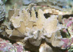 • subarborescent or laminar with vertical spires Husbandry: A note regarding the movement, especially the collection and shipping phases of this family's members. They are fragile skeletoned and copious producers of mucus and other wastes and should be not be fed for a good week ahead of long distance travel, and packed "heavy". That is, with plenty of water per specimen, as many of these corals are lost in transit from their own pollution, and with loose 4 mil bagging material packed with them to prevent rubbing and breakage of their delicate skeletons en route. Placement: Must be carefully placed so that their strongly-stinging sweeper tentacles don't reach other immotile invertebrates. Count on at least six inches in any direction as a "no man's land" between them and other Stony and Soft Corals. Further, they should be placed on sloping hard (rock) surfaces that affords gentle current around them and given enough circulation to remove any accumulating detritus. Light/Lighting: Need not be intense, and these corals are often best placed off to the side of bright light sources, particularly metal halides. Reproduction: Various species have been reported to spawn in captivity and are known to be hermaphroditic. Most all specimens are wild collected with some asexually fragmented and resold/traded by local hobbyists. Due to slow growth, and current low-demand, Pectiniids are not yet commercially produced in ready numbers. Foods/Feeding/Nutrition: All the Pectiniids are photosynthetic and do best in exposed, brightly-lit conditions. Additionally they all do feed at night with long, near-transparent tentacles. Some aquarists do, some don't... feed theirs that is. These corals are at their best being offered some fine-particulate meaty foods on an occasional basis. Disease: Principally arises from mis-collection, shipping damage, and consequent handling. Take care to handle these animals by their bottoms to prevent laceration of their thin living tissue. Exposed areas are best kept free of algae by utilizing small, more-gentle species of mainly-herbivorous Hermit Crabs. Ones obviously infested (with discolored jelly masses, receding tissues) may be aided by use of dips (lowered spg, hexose sugars, iodine or dilute malachite), and placement in sterile water under low illumination. Cloze: Other than some members penchant for stinging other nearby Stony and Soft Corals, and perhaps their slow growth, the Pectiniids are a group of interesting, easy to care for coral species that deserve far more representation in the ornamental aquatics fields. Perhaps with the release of several new "Coral Books" and their popularization, consequent easy, though slow asexual fragmentation in the hobby, the Lettuce Corals will come into their own. Bibliography/Further Reading: Borneman, Eric H. 2001. Aquarium Corals, Selection, Husbandry and Natural History. Microcosm/TFH Charlotte, VT. 464pp. Fossa, Svein A. & Alf Jacob Nilsen. 1998 (1st ed.). The Modern Coral Reef Aquarium, v.2 (Cnidarians). Bergit Schmettkamp Verlag, Borhheim, Germany. 479pp. Vargas, Tony. 1998. Feature Coral (column/series): Pectinia. FAMA 1/98. Veron, J.E.N. 1986. Corals of Australia and the Indo-Pacific. U. of HI press, Honolulu. 644 pp. Veron, J.E.N. 2000. Corals of the World. Australian Institute of Marine Science. Queensland, Australia. three volumes. |
