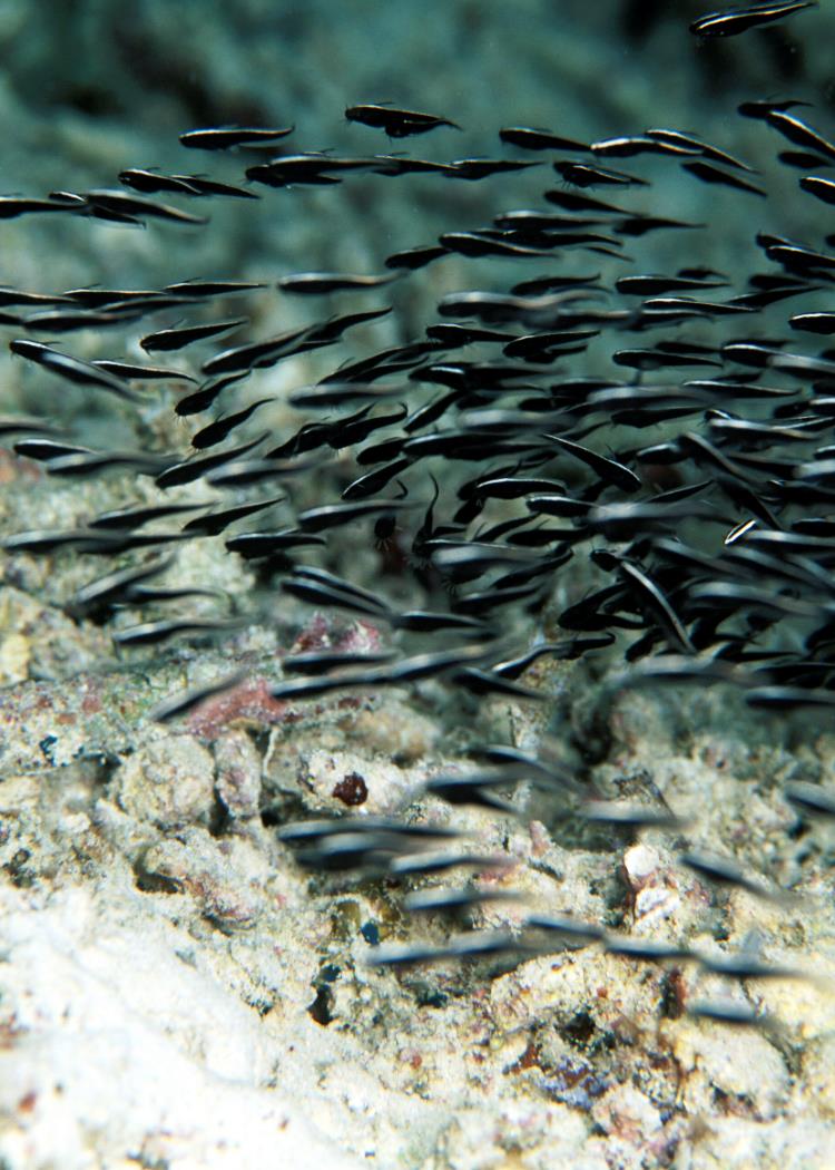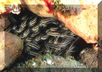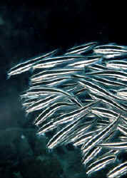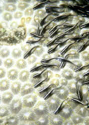 Size: Most individuals offered are ten to fifteen centimeters (four to six inches) in overall length. The species offered to the retail rarely exceed a foot in captivity, though some are recorded exceeding a yard in the wild. Selection: General to Specific This is actually a relatively easy group to sort through for viable specimens. Being naked (as opposed to armored, all catfishes lacking scales) the plotosids take a real beating if handled and shipped without care. Take a close look at potential buys; are their whiskers intact, all about the same length? Are the eyes clear and bright? Any puncture, scrape or red marks on the body? Any of these symptoms on any of the individual cats in the system is cause for concern and a signal to let them by. Collecting Your Own Can be done, with care, if you're in the area. When small, these can be hand netted right out of a group. Utilize either a very fine or coarse mesh net to avoid entangling. If one gets caught in the net, clip it out with a tool. I'm not joking; do not touch plotosid cats with your hands, gloved or not. Their pungent dorsal and pectoral spines are supported by poison-generating epidermal tissue that packs a powerful sting. More about this below. Environmental: Conditions Not picky animals as far as water make-up goes, coral cats appreciate strong current and hiding spaces. Habitat Broken to mixed bottoms, sand/gravel and coral/rock rubble. Often seen aggregated in flanks or balls on sandy bottoms; spawners lay eggs amongst rocks. Chemical/Physical A good quality salt mix (pre-mixed for a day before use) of a consistent high or low range salinity is fine. Keep your eye on pH shift with the heavy feeding that goes with these fishes. Biology/Other The issue of envenomation. Speaking from first hand experience..., you do not want to suffer these fishes painful stings. Pain is immediate and excruciating. My last bout occurred while "putting away" a large incoming Philippine shipment. A carelessly dropped cat poked me under the fingernail while I tried to scoop it up with a net on the receiving table. Knowing what would ensue I told my cohorts to keep an eye on me, wrote down the name of the fish (Plotosus lineatus) in case I lost consciousness, and rushed off to the bathroom to soak the wound site in as warm/hot water as I could stand. Quickly heating the proteinaceous poison goes a long way to denaturing it; changing its structure, therefore reducing pain. If you get jabbed, I strongly suggest you do all the above and additionally be ready to make a trip for professional attention. I obviously survived, with just localized pain and swelling, and a great deal of angst. One other interesting behavior mention; their sound production. These cats hum or buzz loud enough to be heard outside the aquarium. Listen closely when feeding. Filtration Need not be elaborate. However, the more circulation, the better. Need not be elaborate. However, the more circulation, the better. Display The smaller species offered are only happy in a small group. Buy a small, odd number (3,5,7...) and introduce all at once. The freshwater members can be successfully kept singly. Behavior: Territoriality The larger members of the family may be testy toward members of their own kind as they grow bigger. all will gladly swallow other organisms small enough to fit in their mouths. Other fishes knowingly give the plotosid cats wide berth. The larger members of the family may be testy toward members of their own kind as they grow bigger. all will gladly swallow other organisms small enough to fit in their mouths. Other fishes knowingly give the plotosid cats wide berth. Introduction/Acclimation Any technique works with these fishes. Big wholesalers check and ameliorate pH and salinity differences going from shipping to placing in their systems. Predator/Prey Relations Coral cats are non-specific invertebrate predators. Marine forms focus on interstitial (between substrate) fauna (i.e. various worm groups, crustacea, mollusks...). Freshwater varieties more insect- and piscivorous. Other large fish-eating predators leave these catfishes alone; even when/where the species natural ranges don't overlap. Perhaps they recognize the folly of swallowing something with three stout venomous spines sticking out at oblique angles. Reproduction, Sexual Differentiation/Growing Your Own: Spawning records for P. lineatus state that this species spawns during the summer months, males constructing nests in shallow, rocky areas. The eggs are small 3-3.5 millimeter in diameter and guarded by the male for about ten days. Some Japanese public aquaria report captive spawning success for this species, feeding the newly yolk-absorbed young on freshly hatched brine shrimp. Feeding/Foods/Nutrition: Types, Frequency, Amount, Wastes All foods, pellet, frozen, fresh, flake are accepted greedily by healthy specimens. I suggest twice daily feedings, at least once with defrosted frozen food that can be easily be placed in a given open area on the bottom. They grow quickly when well fed and fade away just as fast if starved. Disease: Infectious, Parasitic, Nutritional, Genetic, Social Plotosid catfishes are unfortunately quite susceptible to the common parasitic scourges of marine aquaria, and doubly unfortunate in their intolerance to common aquarium therapeutics. Just like your experiences with "naked" freshwater cats, you will want to look to them first for signs of fish disease in the system and treat very carefully. Avoid copper and malachite containing treatments in favor of freshwater dips, lowering salinities (gradually... as long as other tankmates are euryhaline) and more novel modes (e.g. Quinacrine and other Quinone compounds). Summary: Provided you start with a clean, parasite-free grouping of the smaller Plotosus or a good individual of a larger species, stinging cats are a breeze to keep. Just keep metal and dye medications and your hands away from them. They're cute and comical appe