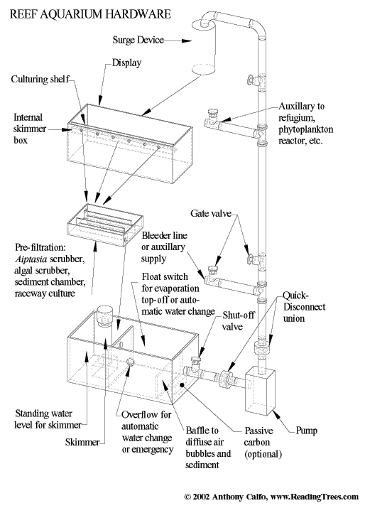 The purpose of a plumbing arrangement in a marine aquarium set-up is to conduct water to and from various components, sumps, possibly drains in a conducive, quiet manner... w/o spills, drips, salt-creep, continuous checking and repairs, too-much induced drag... Few actual arrangements come very close to achieving these ends. The following notes, suggestions and examples will hopefully help you to avoid costly mistakes... Planning: Measure Twice, Cut Three Times: The plumbing of your saltwater system is likely the most perilous and adventurous part of your aquarium system... Do it on paper first! It is immensely more satisfying to erase a line, valve, coupler with an eraser and redraw it, make a shopping list and only have to go to the store a few (versus several) times to get parts and tools... then to find your plumbing diagram/scheme won't work, your diameters are off, you're short a part/tool... Believe me, "been there, done that"... too many times! Maybe you're really familiar with a CAD-CAM computer program, but most folks do fine with quadrille paper (for estimating size) a pencil, straight-edge and a BIG eraser. Draw out the basics of your main/display tank, any sumps, reservoirs, refugiums you intend, how they will likely be juxtaposed (measuring and drawing their dimensions as well as stands/supports), AND THEN consider how and where they might best be joined by plumbing. Space! Take a look about the area you will be placing all this gear... is there sufficient space to get around, reach all? I'm not just talking about the obvious gap/s behind, on the side/s of the main tank, but the entire three dimensional aspect of the entire arrangement. "Oh, I won't need to get behind, around XXXX once it's all in place"... Ha haaaahhaaa, oh, you're killing me! Don't make the simple mistake of closing all the sumps, filters, pumps into too small an area... leave/make room to get to all... and I mean all of the plumbing, equipment such that you can repair, easily remove it if necessary. It may well be necessary. Choice of Materials: Pipe and fittings should be, of course, chemically inert. No metal parts, not even band clamps need apply! If you need a clamp, there are sturdy all-plastic varieties available... PVC (Poly Vinyl Chloride) pipe is the material of choice, generally "Schedule 40" (rated for up to 400 psi pressure), though there are clear plastics (that won't stay so...), ABS, even advocates of flexible tubing... For practical purposes, unless there is some strong compelling reason/s to do otherwise, do use PVC... of Schedule 40 construction... a comment though: there are times, places where some fittings, like unions, may only be available in Schedule 80 (rated fro 800 psi)... and applications like thread in adaptors (as in nipples to/from pump volutes) where Schedule 80 makes sense... But do avoid thinner walled PVC (e.g. Schedule 200) as this material is just too flimsy, hard to solvent securely, easily broken... to be practical. The Actual Arrangement: Due diligence, what does it mean to you? Here it means investigating enough to make intelligent choices/decisions on what is best for your system... How many through-puts (bulkheads, gas-jet fittings, thru-hulls...) of what diameter will you want/need? Where should they go? Maybe an overflow standpipe arrangement is better for your application? Perhaps even an engineered or DIY tower of some sort? How big is your pump? Where should it be placed? What about sizing the tubing to/from it? Should you leave open/space for adding other discharges, returns for a sump/refugium later? All these issues and more should be considered before even buying your tank... as both glass and acrylic models can be custom-ordered/made and the former are much easier to drill/fit for lines before assembly. Check with your dealer or fabricator re this possibility. You'll be very glad you did. Don't lose your mind! Or sense of purpose here in working out the plumbing arrangement for your system. There are indeed "many roads" to Rome and getting the water about for your saltwater set-up. The very best advice (what I would do) is to visit shops, other aquarists, closely examine their rigs and ask them what they might do differently had they to do all over again. Plumbing and Fitting Size: There are tables of tubing/plumbing size recommendations per any given run (length) of line, as well as mathematical formulae for increased drag (or alternatively needed flow pressure) for given reductions in diameter, 90 degree, sweep turns... These can be found in reference works, even pet-fish ones, as well as on the Internet. A few standard suggestions apply to all arrangements: 1) For most applications, using tubing of greater diameter than the volute fittings on your pump/s (intake and discharge) is not beneficial. You won't get more flow, save electricity, quiet the pump or water movement noise... by bushing up the lines here. 2) Practically speaking there is no "too large" overflow line size or number of overflows themselves. If you think 1" diameter through puts will do, go with 1 1/4" or even 1 1/2". Think you can get by with one overflow line of large/r diameter? Use at least two overflows... trust me here... as one is very likely, make that VERY likely to fail, get clogged, blocked by any number of circumstances, events. Systems of more than a hundred or so gallons should have at least three overflow lines... I've seen very big tanks with numerous overflow lines and even a safety set drilled/made a bit higher "just in case" the lower rung failed... they do. 3) Avoid excess, extra twists and turns in your plumbing arrangement. All those tees, elbows, couplings, gate valves... anything that restricts flow is to be reduced to a minimum. All such impediments reduce flow, add resistance to your pump, increase the cost per unit flow. Through-Put Fittings: Call them Bulkhead Fittings, Gas-Jacket/Spa Fittings, Through-Hull Fittings... these are all plastic devices fitted