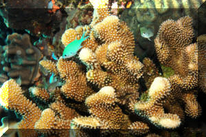 (Similans, Thailand) at right and an aquarium colony. Close up, 1 meter