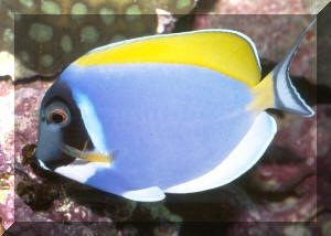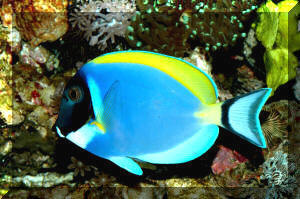 Quarantine: Powder Blues are one of the notorious "ich magnet" species of Surgeonfishes, and should definitely be quarantined for at least a two-week period of time before being introduced to the main/display tank. Even then, they will be amongst the first to show signs of pathogenic or environmental disease should something be amiss. If you'd like, do consider adding a prophylactic freshwater dip/bath (of a few minutes duration) to the acclimation to quarantine process. It's advisable to add Methylene Blue to the pH-adjusted freshwater to both increase its capacity for oxygen holding as well as calming the dipped specimen. Aquariums: Size, Type and Time This is a wide-ranging, fast-swimming vigorous fish that needs plenty of room. The smallest tank I recommend for their keeping is one hundred gallons. At full potential size of about a foot in length, this would only be six times the length of the fish… not too much to ask for. Acanthurus species do best in reef aquariums, or at least ones with plenty of healthy live rock. Powder Blues will not survive in a sterile "fish only" setting. About tank shape, less "show" and more "standard" tank dimensions are preferable. Lots of rock to graze on, zoom about is of more use than the room to swim up and down. The age of the system is important on two principal counts, maybe three. More aged systems are best because they will be more stable chemically and physically, as well as likely having more filamentous algae to graze on. By waiting for six or more months before introducing your Powder Blue, you are likely placing it as your last fish, the proper order of introduction. Water Quality: Organics should not be allowed to accumulate in this fish's tank. Amongst reef fishes that "show" signs of nitrate et. al. concentration, Powder Blues rate up near the top. Oversized filtration, circulation, aeration and skimming, along with the use of quality salt-mix (e.g. Instant Ocean, Reef Crystals, Tropic Marin) and regular water changes are necessary. Nitrates should not exceed any more than 10 ppm; pH should not be allowed to drop below 8.2. Temperature can play a pivotal role in Powder Blue health. They are happiest in warm water, something in the low 80's F. If yours shows signs of disinterest in feeding, consider elevating the tank temperature. Foods/Feeding: Nutrition or should I state, a lack of nutrition is likely the principal cause of loss of this species in captivity. Too often specimens arrive too starved to recover and/or are placed in circumstances where they cannot sustain themselves. It may seem counterintuitive but there is reason to believe that supplying a "fully nutritional" staple food is of at least as much benefit as being conscientious about having greenery available at all times. I have seen very healthy Acanthurus leucosternon that have been fed only on "Spectrum" (New Life International, Inc.) foods for instance. Tankmates: Similar appearing fishes, and ones utilizing about the same ecological niches should not be placed with Powder Blues. Other Tangs will often be challenged, sometimes to the extreme, and other algal grazing fishes may not fare any better. As they can be overtly territorial, it is best to place your Acanthurus leucosternon as the last fish in the system. On the issue of how many, one is the magic number for all but the more huge (thousands of gallons) systems. Though they're sometimes encountered in the wild in shoaling schools of hundreds of specimens, most often there is incessant fighting with more than one in an aquarium. In Conclusion: Powder Blue Tangs have had a dismal survival history as aquarium specimens. Their easy loss is attributable to inherent poor adaptability to captivity, as well as the rigors of collection, holding and shipping from afar. Folks who would successfully keep this fish can undertake several ameliorative measures. Careful selection, provision of adequate habitat and feeding most notably. Folks who would keep Acanthurus leucosternon are advised to pay attention to the above points or seek out more suitable aquarium fishes for display. Bibliography/Further Reading: Debelius, Helmut. 1993. Indian Ocean Tropical Fish Guide. Aquaprint Verlags, Germany. Fong, Jack. 2000. The Powder Blue Tang- hardy or delicate? FAMA 3/00. Kuiter, Rudi & Helmut Debelius. 2001. Surgeonfishes, Rabbitfishes and their Relatives. A Comprehensive Guide to Acanthuroidei. TMC Publishing, Chorleywood, UK. McKenna, Scott. 1987. Keeping the powder-blue surgeonfish. TFH 36(3): 22-25,27