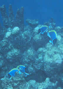 Amongst the more difficult marine fishes to keep is the Powder Blue Tang. Yes, though it is amongst the most commonly offered species of Surgeonfishes you see at retail fish stores, this Indian Ocean beauty rarely lives for more than a few days to weeks in captivity. It is likely a host of contributing factors that make Acanthurus leucosternon such an easy-dying species for aquarists. The fish takes a beating being held and shipped from such long distances through the chain of custody to the "end user". It is also one of the species of fishes that has a large (dozens to hundreds of square meters) territory in the wild and doesn't take well to the "small clear boxes" which are our tanks. Lastly, this is clearly a "grazing" species that samples algae and related benthic infaunal organisms on a continuous basis during the day, and frequently succumbs to a lack of nutrition. However, there are some "success stories" with the Powder Blue and some solid points to make that greatly increase ones chance of keeping it in an aquarium. Here I'd like to offer my observations, accumulated first and second-hand experience with what DOES work in maintaining Acanthurus leucosternon alive and well.