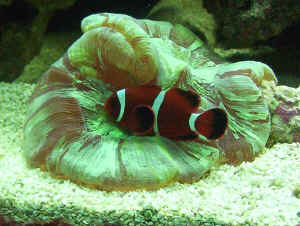 Hanging by a Xenia! And...the Homeless Clownfish Hello Crew, <Scott F. here with you> I had purchased a Xenia from Liveaquaria.com, and it came in today, but I noticed that one was hanging by a limb. What should I do? It's just a small Xenia, about half an inch tall. Should I cut it and rubber band it together with 2 small rocks, leave it, or do you know of a better way? I'm scared to cut it because of its size, and due to the stress of shipping, I don't think it will be able to recover from a propagation attempt. <Well, if it were me, I would leave it be for a couple of days. If it does not appear to recover, you may want to excise the damaged portion and leave the remainder in an area of the aquarium where it can recover. Xenias are extremely hardy (kind of the weed of the coral world!), and usually can recover from such traumas given time and good conditions.> Also, I have another question, too. I had purchased a bubble-tip anemone for my Perculas because they were not happy without their own anemone like my Maroon clown. Well, the Maroon wanted more property and took to both bubble-tips. Is this normal? <Well, Maroons can be quite territorial, and can certainly take over a given area, including the anemones.> Is there any way that I can make him leave so my perculas might have a chance in having an anemone? Thanks, Chris. <Short of removing him from the aquarium, probably not. This is one of the reasons why we generally advise against mixing various clownfish species in one aquarium, particularly the Maroons as they can be quite nasty. Well, keep a close eye on things and maybe the social order will settle down and everyone will be happy. Good luck! Scott F.> Two New Maroons I am quite concerned about the behavior of our two maroon gold stripes recently introduced to our tank about a week ago. We have a 45 gallon tank with all the filtration and lights required to grow a nice reef tank. No other fish in the tank, a few (3) turbo snails, some hermit crabs and one cleaner shrimp. <I would likely not add any other fish to this system... the Maroons are territorial, and can be real terrors in small systems they occupy initially> The two fish are a tank raised pair. Up until last night they were eating quite regularly (although the larger fish didn't seem to have the same appetite as the smaller fish), and were highly active during "daylight" hours. They camped out in a live rock "cave" after the lights shut off. Last night, the larger maroon clown was backed up in the upper corner of the tank - very still and essentially vertical. The smaller clown was right with him. The two fish remained there for through the night, and were still like that this morning. They were not at all interested in food this morning. <Mmm, not atypical behavior for the species when new...> The two appear healthy (no changes in color or appearance) and up until last night were quite active. I don't want to be too sensitive to changes in behavior, but thought this was odd. Any thoughts you have would be very helpful. Christine <I would just wait/see what happens at this juncture. Bob Fenner> Re: Two New Maroons Thanks for your thoughts. Unfortunately one of the clowns died last night. We are heartbroken. All of the water tested fine this morning. There were no obvious signs of illness. From some of the posts on your website, it sounds as if this is not entirely unusual. <Sorry to read of your loss... Anomalous losses of wild-collected Clownfishes is very common as you state. If you can locate a much smaller individual (than the survivor) they may "mate"... I would not wait more than a few weeks to introduce the new one. Bob Fenner> Clownfish and anemones Hello, <Howdy!> a few questions could you please answer I have just got a bubble tip anemone and a pair of maroon clowns one is about 9 cm long and the other is only 2-3 cm long I was wondering will they mate if so then when?<They probably will, I couldn't tell you when as there are many factors that effect this from the fish themselves to their environment.> What factors are they? <<The size of fish, tankmates, size of tank, how long they have been together, water quality, if they have a anemone or not...>> The bubble tip anemone keeps moving around, is it normal what is wrong, also how can I stop it from moving? <Do you have enough lighting? If so just let him be and he will find a place that he likes.> I have 2 actinics and 2 daylights is that enough and is that alright? <<What size of tank do have, what kind of bulbs and what wattage?>> I have a 5 ft tank and 4 ft lighting with 2 40w actinics aqua coral and 2 36w daylight Sylvania <This is not nearly enough lighting for these guys. You will either need to return him or invest in some more lighting. Again you can find tons of info at our site mentioned below.> Should the anemone be on rocks or is it ok for it to be on sand? They usually climb up onto your rockwork. Cody> The anemone is half on a rock and half on sand, is that ok? <<Sure. You can also find lots of info on our website: www.wetwebmedia.com.>> Is there a problem if the anemone doesn't stop wandering?<It is probably still wandering because of the shortage in lighting. This guys needs to be moved into a more suitable environment quick or his needs to be improved upon. In the future please research all purchases before you buy them and don't just listen to the fish stores advice as unfortunately many are just out there to make money and don't care about the animals they handle or are not very well educated. Cody> Maroon Clown Attacking Flowerpot Coral 2/5/04 Hello, I have a 55 gallon reef tank, with 5 small Chromis, 1 2-inch maroon clown and a cleaner shrimp. Recently the maroon clown has been getting more feisty, most alarmingly he has started to attack the flowerpot coral going so far as biting off pieces of it. The clown has a bubble tip anemone host, which I have just gotten recently but his aggression seems to have gotten worse if anything. Water