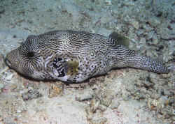 regards, Anthony> Puffer Symptoms <Anthony Calfo here in Bob's stead while away> Hi! I have a narrow line puffer, dog face puffer, scooter blenny and recently added a very small long horned cow fish. My puffers prior to the introduction of the cow fish went on a hunger strike. <maybe they were trying to warn you that you are getting bad advice on fish compatibility (smile). The scooter with the puffers is entirely inappropriate (scooter will be stresses/harassed/killed then eaten in that order...eventually) and the cow fish grows enormous and needs a species tank> ( I had a hippo tang that survived several bouts of ick but died from lateral line and hole in head disease. In attempted to stop and fix the HLLD process and Ick, I medicated the tank several times with several different meds and spent paycheck after paycheck poly and charcoal filters to absorb all the medications. <A large water change or two would have been light years cheaper and better for the system...although Poly Filters are most excellent filter media> Finally, as a last effort I stopped medicating and was adding Zo? To their frozen brine shrimp and frozen whole prawns. <live crayfish and/or ghost/grass shrimp are also quite nutritious treats> Since this is my first tank, I medicated the tank not the fish. All the fish survived the medicating and re-medicating, even seemed to enjoy the Zo? Being added to their food. I continued the Zo? Long after the hippo tang died). After several days of the puffers acting lethargic, laying on the bottom of the tank not eating, just eyeballing the food, I started them on live food again (Only thing the puffers eat now). <symptoms could just be stress...or related to medicant. As "scaleless fishes, they can be sensitive to medication> As a treat, I added a crawfish and the narrow lined puffer got part of his lip bit off (looks very horrible, I am checking periodically for sign of infection). <Holy cow...I don't see how it is even possible unless the crayfish were raised on wolf cookies and gorilla milk! Puffers eat equally formidable prey in the wild. Do you think that perhaps the puffer could have been nipped instead fighting for food with another puffer? They really have the dentures to hurt each other so bad> While examining the puffer I noticed a yellow tint (like the color of your water when the charcoal filter stops working) to the otherwise lighter grayish colored areas of his body. Is this normal? <could be...very high degree of color variation among "dogface" puffer species> I also noticed that his anal and dorsal fin were edged in black, with no fraying. Is he sick? <tough to say without seeing him> Ever since I had purchased the narrow lined puffer from the fish store, about a year ago, the eyes has always been cloudy and his feces are encapsulated in a thin membrane and linked together in a chain. <such a short term symptom could indicate internal parasites, but long-term may just be a reflection of diet> The narrow line puffer loves to eat the pieces of algae sheets I was trying to feed to the hippo, so his feces are green not white or clear. <very good for him. Puffers eat prey that eat algae in the wild and it is inherently part of the diet> The puffer has gained weight and doubled, even tripled his original size and the cloudiness of his eyes has not changed. Is the puffers feces normal or does he have internal parasites and are cloudy eyes normal for puffers? <the cloudy eyes could be a few things...again, tough to say without seeing the fish. Does its vision seem impaired?> I also notice periodically both the puffers appear to cough or even sneeze, can you tell my what this is and why the puffers would do this. <Puffers often blast water near the substrate as part of a feeding/foraging technique. Yawning has also been observed in systems with accumulated nitrate> Lastly, with the addition of the cow fish do I really need to continually use a poly filter, in case of toxins? <I wouldn't recommend the cowfish at all... a great risk and even if it wasn't poisonous, it is inappropriate for all but the very largest tanks. Rather cruel to put it in a 90 gallon or smaller even if it is small now. Quite frankly, with consideration for the number of fish you've mentioned and some of their adult sizes, I'm really hoping that you have a large tank (over 100 gallons for starters). If not, please consider moving some fish out for their good health. Overcrowding increases occurrences of stress and disease. Kindly, Anthony> Lionfish/porcupine puffer compatibility Hello Do you happen to know if my porcupine puffer (about 6 inches long) would pick on a lionfish? <Yes... a very real, and frightening possibility. Puffers can tease, nibble Lionfishes mercilessly> The Volitans type. NOT a dwarf lion. One of my LFS said the puffer absolutely would constantly pick on a lion, darting back and forth and nipping on his fins. Another LFS (just as reputable, if not a little more knowledgeable), said the two would be fine together. All of my resources (book wise) say nothing about keeping the two together, but most everything says lions are fairly docile, as are porcupine puffers. <The operative term here should be "can". They can get along or not...> And if it helps any -- the tank is 75g's and is fully cycled. It houses a 2' 3" peppered moray eel and a 6 inch porcupine puffer. I do 30% water changes every two weeks or so, and the ammonia and nitrite are zero, always. I'm very diligent about cleaning. :) Another question, if you have time -- I lucked into my moray eel, and am having a lot of trouble finding any info on them. I did find one page with a few small paragraphs about him, but otherwise...no one seems to have heard of my eel. He's commonly called a "peppered moray," but the scientific name is "Siderea picta." He's got beautiful coloration, all white with tiny black speckles all over his body and light blue circles around his eyes. Very bold...not shy at all. <Mmm, a very nice species..