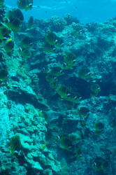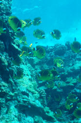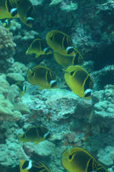 Both species bear black and white crescent bands over the face and eyes raccoon-mask-like imitating their terrestrial namesake. They're similarly colored yellow, black and white on first glance, yet look closer. The Red Sea species lacks the Indo-Pacific's caudal peduncle (the area right before the tail fin) black spot and oblique yellow stripes behind the head. Note also the differences in the Red Sea's white masking (less), it's bolder, more variegated body band markings, and gorgeous red margining on the unpaired fins. Size: Raccoons can tip the scales at more than nine inches, total length, and grow an inch or better in a half year. Not the biggest B/Fs, but close. They need room to swim and grow. Selection: General to Specific The following course of observation and action... 1) Timeliness: How long has the dealer had the fish? I strongly suggest holding off purchasing butterflies for a good week or two after arrival. Shaky individuals will have straightened out by then, or gone the route. 2) Feeding: Any marine fish of considerable cost should have to pass the acid-test of whether it is eating. No feeding, no sale. 3) Appearance: Off color, and any reddening of the mouth or fin bases should disqualify a prospective purchase. Most often due to mis-handling, such specimens refuse food, rarely recuperating. 4) Size: On acquisition is important. Small and large butterflies ship and adapt poorly; avoid ones under 3 inches and over 5 if at all possible. Intermediate size specimens acclimate well to captive conditions. Collecting Your Own Can be done if you just happen to be in the area. These and all other Butterflyfishes are captured using a "fence net" arranged as a barrier, and hand nets (and possibly poles) to drive intended specimens against it. Environmental: Conditions Habitat Raccoon B/Fs live in shallow regions of coral reefs; with both ready holes to swim in/out and dive into, and plenty of open space. Note that these species can and do get pretty big (more than hand size), and don't tolerate crowding; a small specimen requires a good fifteen gallons itself, a larger individual a minimum of thirty. Chemical/Physical Butterflyfishes as a whole do not appreciate much in the way of nitrite or nitrates. A successful approach to their keeping is to place them in established (six months plus) aquariums that are adequately equipped with filtration geared toward maintaining low organic concentrations (e.g. fractionation, chemical absorbers). Steady and high specific gravity (1.025 for both species), and pH (ideally 8.3) are requisite. Bottom line; these fishes need consistent high quality water. Filtration A "dream" filter set-up might involve a separate "refugium" aquarium to circulate water to and from your main display system. This other tank would have its own lighting gear and be filled chock-a-block with thriving live rock, a live sand arrangement to eliminate nitrates, heating, protein skimmer... even provide some supplemental live food! Behavior: Territoriality Raccoon butterflies are most often seen singly, periodically in pairs, only occasionally in groups. Unless you purchase or capture them together, they are best kept one to a tank. Likewise, other Butterflyfish family members can butt-heads should they be closely matched size-wise or if the system is crowded. My suggestion is to keep an inch or so difference in your new chaetodonts and introduce the smallest first, with a few weeks span between them. Introduction/Acclimation Following a two week quarantine (or at least a brief freshwater dip), even coming from a reputable dealer, a "mixing" or "dripping" of waters acclimation procedure should be followed, placing the new specimen in its new home under low illumination for a day. Do this when you have time to observe carefully; the first minutes to hour are critical in terms of determining whether or not the raccoon will "take" or be accepted by its tankmates. Watch your livestock. Predator/Prey Relations I've heard of small Chaetodon lunula kept in reef set-ups, but I don't advise it; raccoons will pick at coral and sample other soft-bodied non-vertebrates to pieces. Raccoons are good community fishes for fish-only types of systems. Other fish species leave them alone, unless they're bite-size, and they are generally "live and let live" in attitude with the possible exception of members of their own kind and similar size and shaped butterflies. Reproduction, Sexual Differentiation/Growing Your Own: Butterflyfishes are egg-scatterers, releasing their gametes to the whims of surface currents cued by moon and tides. Larval young develop through a strange armored "tholichthys" stage as pelagic plankton, settling down (hopefully) as miniature adults. Per most chaetodonts, the raccoon species are indistinguishable sexually. All specimens are wild caught. Feeding/Foods/Nutrition: Types, Frequency, Amount, Wastes As mentioned previously both raccoon species are enthusiastic eaters. Once trained on non-live foods you will have to literally "beat them with a stick" to get them to not feed. New arrivals may require live offerings initially; brine shrimp, Tubifex work well, as does an opened fresh clam. In the wild raccoon B/Fs feed primarily at night, so initially offering food toward the evening is worth considering. I have seen these fishes maintained on little more than dry-prepared foodstuffs, but with consequent loss of color and vitality. Do alternate meaty foods into their diets (shrimp, clam, mussel, frozen insect larvae, etc.) on a regular and frequent basis. B/Fs are browsers that become "bored" and skinny when fed only once a day; feed often, small amounts. Disease: Infectious, Parasitic, Nutritional, Genetic, Social Except on being collected or exposed to new livestock that has brought in "bugs" with it, these fishes are historically "clean". If yours look punkish, are refusing food, look first and foremost to diminished water quality, and second to "bullying" by a tankm