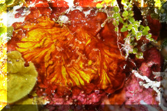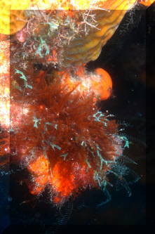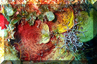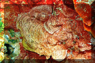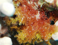 Mottled red and orange usually. Roughly fan shaped growths. Roatan 2016