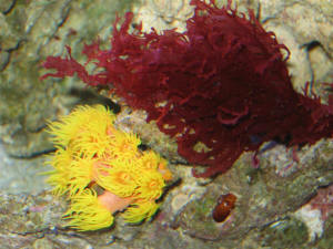 Marine operation/maintenance and red algae I'm a newbie learning the ropes and finding your site was priceless. (maybe you should do MasterCard commercial....) You guys are awesome for all you do! Thank You! Thank You! Thank You! (should I suck up some more?) <Please no more! We all do this because we love the hobby. It is sincerely our pleasure!> We are building a reef. Going very slow! A little over three weeks into it and tank has cycled and Coralline is coming on STRONG! Only thing we've added is 6 Turbo Snails. Refraining from adding creatures is HARD, but know (thanks to you guys!) that patience will insure success. We want to continue research and have a complete livestock list and a clear plan of attack rather than randomly adding things... It is a 55g w/ 88lbs live rock and a 10gal overhead refugium. I'll spare you the rest of the peripherals and get right to my ???'s. <That sounds like a lot of rock! Is there any room left for animals<g>? It sounds like things are coming along nicely, and Kudos for your patience!> In the refugium I have an 8lb live rock which has lots of barnacles. When we first bought the rock it was covered with waving cirri. I have since seen many dead cirri floating around. Inevitably they are dying from a lack of phytoplankton? <Phytoplankton or other suitable food. These animals typically are not long term aquarium survivors.> They are, however, reproducing as we've seen many cyprid larvae running around. "What the hell is your ?" (You asked that at just the right time!) Is it worth trying to feed these and save them or not? I found a post, regarding DT brand liquid phytoplankton, suggesting that this brand had appropriate size particles. I could shut down the 'fuge flow for a short time and feed them, so as not pollute the display. I feel responsible to try and support them since I bought them (in a round about way). <DT's will provide food for many larval organisms, and if you wish to use it you will likely see some benefits. No matter what you do, it is unlikely that you will grow anything but amphipods, copepods and mysids to maturity. Because of long pelagic larval stages, most other critters will be killed or eaten before they can "grow up". DT's will simply make them more nutritious food items for your corals and fish!> Second ?.... I attached a photo of a plant also growing on this rock.... I'm guessing that it is in the Rhodophyta family, but haven't been able to find a photo exactly matching it.... Is this a good plant to leaving growing for nutrient export? Lastly, I would like to add some additional snails to help keep microalgae in check (still researching what we want for macroalgae). Can we add these without quarantine since there's nothing else in the tank? Thanks again! Brad <Your algae is too small to be sure, but it is most likely Gracilaria. It has the advantage of being great food for herbivorous fish, but is relatively slow growing compared to Chaetomorpha or Caulerpa. You can add the snails without quarantine, but if you wish to follow a strict protocol in the future, you must wait several weeks before making any other additions. Best Regards. Adam> Gracilaria in the sump Greetings Gents! << Blundell today. >> I have a miracle mud system that has been running for about 1.5 years. Things are doing well, and the sump is filled with Caulerpa. I am trying to grow SPS and think it is time for a change. I am going to attempt to replace the Caulerpa with Gracilaria, (Tang Heaven) which I purchased a ½ pound from IPSF.com. Do you think this is a wise choice? << Pricey stuff, but good stuff. >> Are there any precautions or procedures that I should take when replacing the Caulerpa? I am thinking that I need to have the Gracilaria grow for a few weeks and slowly remove the Caulerpa in small daily bunches. << Sounds great. Gracilaria is not nearly as easy to grow, so it may be tough getting it established. >> Any advice would be kindly appreciated. << Blundell >> Tap water Rinse for Aiptasia? Another Infestation of Aiptasia after Buying Gracilaria - QT! Dear Crew, <Paul> After receiving in the mail, a half-pound of beautiful Gracilaria parvispora infested with Aiptasia, I am at a loss as to what to do with it. Currently, it is isolated in a bucket of saltwater with lighting and aeration but the vendor does not seem to want it back. Is it possible to completely kill the Aiptasia and its larvae by soaking the Gracilaria for several minutes with chlorinated tap water? <Mmm, no> I don't want to contaminate my aquariums but I hate to simply throw out the Gracilaria. Thanks, Paul <I would go the route of using a purposeful Glass Anemone predator with this red algae, while still keeping it separate from your other systems. These Aiptasia-eaters are listed on WWM. Bob Fenner> Nitrification/Denitrification and Chaetomorpha linum 8/1/05 Thank you so much for such a prompt reply. <<Glad to help>> I have had a really good look around your site, and I'm still struggling to find a few more answers, so I really hope you don't mind me asking just a few more questions. With the cycling process in a aquarium without a wet/dry filter, where does the ammonia and nitrite conversion take place exactly. The reason I ask, is because I have always previously understood, that the bacteria required to perform this conversion only survives in aerobic conditions. With no wet/dry, there are no true areas where oxygen is constantly present, so where does the ammonia/nitrite/nitrate conversion take place. (or have I totally missed something?) I'm "guessing" that it all happens with bacteria present in the live rock/sand, but all I have read about DSB's and live rock is its ability to convert nitrates back to nitrogen because of the "good" bacteria living in the anaerobic conditions. <<Good guess. There are two processes to consider. The nitrification process is an aerobic process where the waste is oxidized. The denitrification process is an anaerobic process where the waste