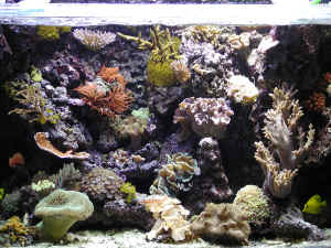 Protein skimming; Is different here as well. As you'll recall, we waited with fish-only systems to turn our fractionator on after nutrient cycling was established. In fish and/or just invertebrate systems, this tool's use was initiated between the cycling and the introduction of non-fishes. With "reef" systems, the skimmer should be on full-tilt before the introduction of any livestock. Which conveniently brings us to: Livestocking: What is the largest living "thing" on this planet? I'll give you a clue, it always has been the biggest life form. Still stumped? We'll many Life-Science types consider barrier reefs, with the GBR (Great Barrier Reef) of Australia, being the current winner, to be "one large super-organism". My point is, though western reductionistic notions define a separation between those who believe them and the rest of their environment, the real living world is inseparably, indistinguishably interlocked with it's "outside". Live rock and sand are (part) of the living reef in the wild and in captive systems. Author's vary in their advice as to how and when to place live rock and/or sand into a "reef" tank. Some suggest putting it in a separate sump, placing part at a time, "curing" it in a quarantine facility... Here's my take on the issue; after setting up and checking the environmental gear and controllers for a week as previously prescribed, place all or ostensibly all the live rock/sand into the system. Do I suggest you rinse it in some of the "aged" seawater? Sure, if it's real stinky; otherwise just put it in. Live rock goes in over non-living "base" rock (coral skeletons), the sand as your purveyor instructs. A rapid "succession" of events occurs, that can be a visual and olfactory shock to the uninitiated. Be patient. Next comes a waiting period, a few weeks (generally 2-4) for those elements in the mix to die, eat, be eaten; make the system ready for the addition of (more) invertebrates and possibly algae and fishes. With your test-kits you'll record a more or less standard scenario of nutrient cycling, but with a twist; if/when you detect the accumulation of nitrates, they will probably start to decrease at some point. Welcome to the world of real reef keeping. Ongoing Maintenance: A properly set-up and stocked reef system is actually the closest thing marine systems have to being maintenance-free. With attention to balancing the living and non-living components of a reef set-up, they become homeostatic. This being said, the average reef-keeper does spend a few to several hours a week checking water chemistry, adjusting salinity, feeding the livestock, and generally fooling with the system; it's just so enjoyable, most aquarists are unaware of, or don't begrudge the time commitment. Summary: I don't want to dissuade you from pursuing a "reef-system"; my intent is only to urge your considering what an involved enterprise it is. Most tropical reef set-ups have thousands of dollars into them, with their keepers spending hundreds more a month on gear, organisms, food, electricity... and the animals living an average of a few months. Is this challenge for you? Bibliography/Further Reading: Belorusky, Wyn, Jr. 1988. How to build a living reef system. FAMA 5/88 Blackburn, Wayne. 1988. Corals in the reef tank. FAMA 12/88. Delbeek, Charles J. 1989. Reef aquariums: an introduction. AFM 12/89. Delbeek, Charles J. 1990. Reef aquariums: coral compatibility; as a reef tank becomes established, corals will grow and require more space. AFM 10/90. Delbeek, Charles J. 1990. Live rock algal succession in a reef system. FAMA 10/90. Delbeek, Charles & Julian Sprung. 1994. The Reef Aquarium. Emmens, C.W. 1986. The natural system and the minireef. FAMA 9/86. Emmens, C.W. 1992. Coral reefs and miniature reefs. FAMA 2/92. Fenner, Bob. 1990. The revolution of the mini-reefs. Pets Supplies Marketing 1/90. Fossa, Svein A. & Alf Jacob Nilsen. 1993. Stony corals; can they grow in a closed reef aquarium? FAMA 9/93. Frissell, Christopher A. 1981. Living coral in the marine aquarium. FAMA 2/81. Goldstein, Robert J. 1992. The reef generation; advanced technology and healthy livestock attract customers willing to spend money. Pet Age 7/92. Guerra, Manuel III. 1990. Compatible fish for reef tanks. FAMA 7/90. Hemdal, Jay. 1988. Fishes for the home miniature reef. SeaScope Volume 5, Spring 88. Klostermann, A.F. 1993. Coral growth in captivity. FAMA 5/93. Moe, Martin A. Jr. 1989. The Marine Aquarium Reference: Systems and Invertebrates. Green Turtle Publ., Plantation, FL. Riddle, Dana. 1994. Coral nutrition, parts 1-5. FAMA 4-8/94. Paletta, Michael. 1994. Invertebrate propagation and reproduction at home. AFM 8/94. Paletta, Michael. 1994. Selecting healthy corals; making the right choices for your reef tank. AMF 7/94. Paletta, Michael. 1995. The care and maintenance of corals, parts 1,2. AFM 2,3/95. Paletta, Michael. 1995. Plumbing the reef tank. AFM 5/95. Parks, Noreen. 1993. Immortal corals. Sea Frontiers. 1-2/93. Rasche, Jeffrey A. 1988. Fine-tune the homemade reef system. FAMA 11/88. Riddle, Dana. 1994. Coral nutrition, parts I-V. FAMA 4-8/94. Riddle, Dana. 1995. Life, light and lipids; the importance of lipids in coral diets, parts 1,2. FAMA 6,7/95. Schiemer, Gregory. 1995. The reef aquarium; starting from the beginning. AFM 8/95. Smit, George. 1986. Marine aquariums (mini-reefs), parts 1-7. FAMA 1-7/86. Smit, George. 1987. The ecological marine aquarium, parts 1-3. FAMA 5-7/87. Sprung, Julian. 1988 forward. Reef Notes column. FAMA. Sprung, Julian. Captive reefs. TFH 10/88.Sprung, Julian. 1988. Reef theory applied to aquaria. SeaScope Winter 88. Stepanov, Dmitry. 1994. Coral feeding in nature and in the aquarium. FAMA 1/94. Stuber, Dietrich. 1992. Saltwater reef aquarium technique: a point of view from Berlin. SeaScope Vol. 9, Fall 92. Thiel, Albert. 1988. The Marine Fish and Invertebrate Reef Aquarium. Aardvark Press, Bridgeport, CT. Thiel, Albert. 1989. Advanced Reef Keeping. Aardvark Press, B